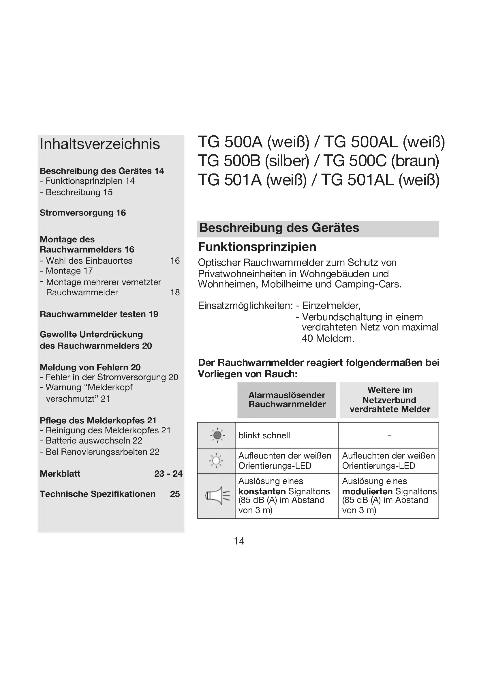 Rauchwarnmelder testen 19 Gewollte Unterdrückung des Rauchwarnmelders 20 Meldung von Fehlern 20 - Fehler in der Stromversorgung 20 - Warnung “Melderkopf verschmutzt” 21 Pflege des Melderkopfes 21 - Reinigung des Melderkopfes 21 - Batterie auswechseln 22 - Bei Renovierungsarbeiten 22 Merkblatt 23 - 24 Technische Spezifikationen 25 TG 500A (weiß) / TG 500AL (weiß) TG 500B (silber) / TG 500C (braun) TG 501A (weiß) / TG 501AL (weiß) Funktionsprinzipien Optischer Rauchwarnmelder zum Schutz von Privatwohneinheiten in Wohngebäuden und Wohnheimen, Mobilheime und Camping-Cars. Einsatzmöglichkeiten: - Einzelmelder, - Verbundschaltung in einem verdrahteten Netz von maximal 40 Meldern. Der Rauchwarnmelder reagiert folgendermaßen bei Vorliegen von Rauch: Beschreibung des Gerätes15
