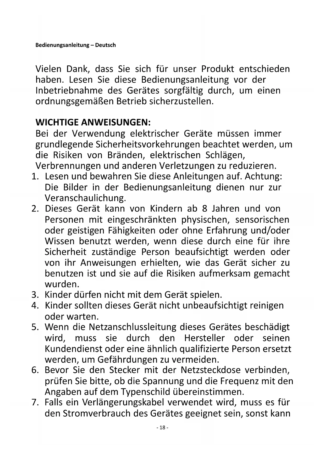 1. Lesen und bewahren Sie diese Anleitungen auf. Achtung: