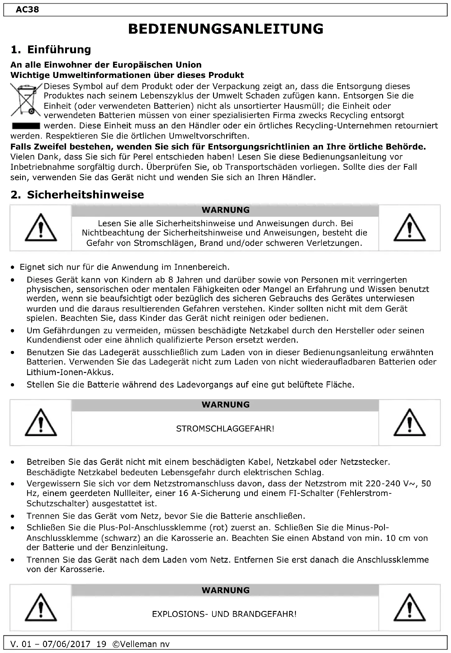 Nenneingangsspannung ........................................................ 220-240 V~, 50 Hz, 0.6 A Nennausgangsspannung .................................................................................... 3.8 A IP-Schutzart ...................................................................................................... IP65 Abmessungen ........................................................................... 211.3 x 84.4 x 49 mm Gewicht .......................................................................................................... 775 g Ladespannung Blei-Säure-Akkus ............................................................................ 7.3 / 14.4 V= kalt/AGM ........................................................................................ 7.4 / 14.7 V= LiFePO4 ..................................................................................... 12.8 V / 4 Zellen Ladestrom 6 V / 12 V / LiFePO4 klein .......................................................................................................... 0.9 A normal ....................................................................................................... 3.8 A Verwenden Sie dieses Gerät nur mit originellen Zubehörteilen. Velleman NV übernimmt keine Haftung für Schaden oder Verletzungen bei (falscher) Anwendung dieses Gerätes. Für mehr Informationen zu diesem Produkt und die neueste Version dieser Bedienungsanleitung, siehe www.perel.eu. Alle Änderungen ohne vorherige Ankündigung vorbehalten. © URHEBERRECHT Velleman NV besitzt das Urheberrecht für diese Bedienungsanleitung. Alle weltweiten Rechte vorbehalten. Ohne vorherige schriftliche Genehmigung des Urhebers ist es nicht gestattet, diese Bedienungsanleitung ganz oder in Teilen zu reproduzieren, zu kopieren, zu übersetzen, zu bearbeiten oder zu speichern.AC38