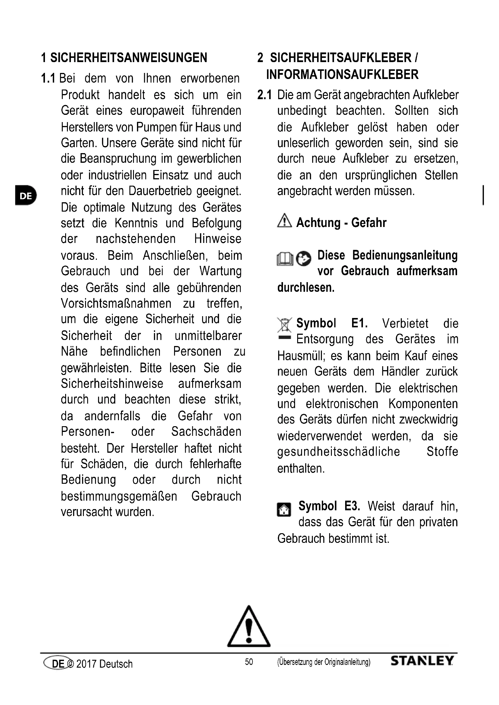 Die am Gerät angebrachten Aufkleber unbedingt beachten. Sollten sich die Aufkleber gelöst haben oder unleserlich geworden sein, sind sie durch neue Aufkleber zu ersetzen, die an den ursprünglichen Stellen angebracht werden müssen. Achtung - Gefahr Diese Bedienungsanleitung vor Gebrauch aufmerksam durchlesen. Symbol E1. Verbietet die Entsorgung des Gerätes im Hausmüll; es kann beim Kauf eines neuen Geräts dem Händler zurück gegeben werden. Die elektrischen und elektronischen Komponenten des Geräts dürfen nicht zweckwidrig wiederverwendet werden, da sie gesundheitsschädliche Stoffe enthalten. Symbol E3. Weist darauf hin, dass das Gerät für den privaten Gebrauch bestimmt ist.51 (Übersetzung der Originalanleitung) DE © 2017 Deutsch
