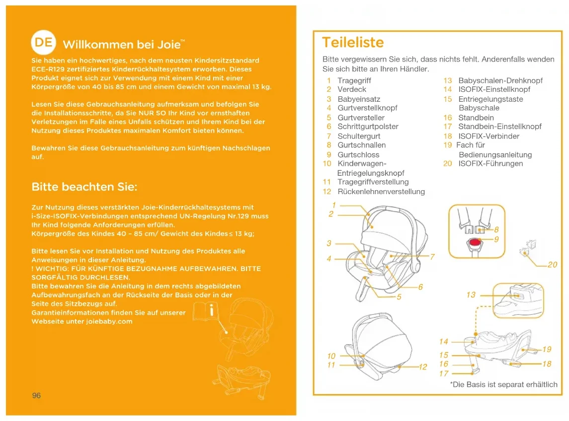 Sie haben ein hochwertiges﹐ nach dem neusten Kindersitzstandard ECE-R129 zertifiziertes Kinderrückhaltesystem erworben. Dieses Produkt eignet sich zur Verwendung mit einem Kind mit einer Körpergröße von 40 bis 85 cm und einem Gewicht von maximal 13 kg.Lesen Sie diese Gebrauchsanleitung aufmerksam und befolgen Sie die Installationsschritte﹐ da Sie NUR SO Ihr Kind vor ernsthaften Verletzungen im Falle eines Unfalls schützen und Ihrem Kind bei der Nutzung dieses Produktes maximalen Komfort bieten können.Bewahren Sie diese Gebrauchsanleitung zum künftigen Nachschlagen auf. Bitte beachten Sie: Zur Nutzung dieses verstärkten Joie-Kinderrückhaltesystems mit i-Size-ISOFIX-Verbindungen entsprechend UN-Regelung Nr.129 muss Ihr Kind folgende Anforderungen erfüllen.Körpergröße des Kindes 40 – 85 cm/ Gewicht des Kindes 13 kg;Bitte lesen Sie vor Installation und Nutzung des Produktes alle Anweisungen in dieser Anleitung.! WICHTIG: FÜR KÜNFTIGE BEZUGNAHME AUFBEWAHREN. BITTE SORGFÄLTIG DURCHLESEN.Bitte bewahren Sie die Anleitung in dem rechts abgebildeten Aufbewahrungsfach an der Rückseite der Basis oder in der Seite des Sitzbezugs auf.Garantieinformationen finden Sie auf unserer Webseite unter joiebaby.com Bitte vergewissern Sie sich, dass nichts fehlt. Anderenfalls wenden Sie sich bitte an Ihren Händler. 1 Tragegriff 2 Verdeck 3 Babyeinsatz 4 Gurtverstellknopf 5 Gurtversteller 6 Schrittgurtpolster 7 Schultergurt 8 Gurtschnallen 9 Gurtschloss 10 Kinderwagen- Entriegelungsknopf 11 Tragegriffverstellung 12 Rückenlehnenverstellung Teileliste 13 Babyschalen-Drehknopf 14 ISOFIX-Einstellknopf 15 Entriegelungstaste Babyschale 16 Standbein 17 Standbein-Einstellknopf 18 ISOFIX-Verbinder 19 Fach für Bedienungsanleitung 20 ISOFIX-Führungen *Die Basis ist separat erhältlich