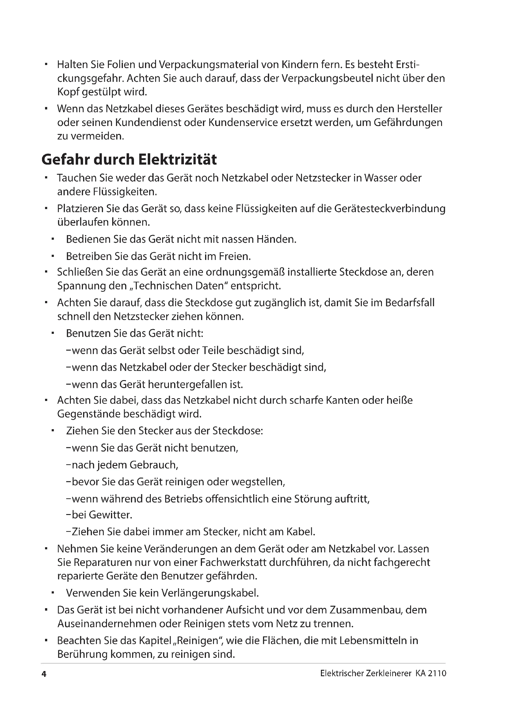 Elektrischer Zerkleinerer KA 2110 Halten Sie Folien und Verpackungsmaterial von Kindern fern. Es besteht Ersti- ckungsgefahr. Achten Sie auch darauf, dass der Verpackungsbeutel nicht über den Kopf gestülpt wird. Wenn das Netzkabel dieses Gerätes beschädigt wird, muss es durch den Hersteller oder seinen Kundendienst oder Kundenservice ersetzt werden, um Gefährdungen zu vermeiden. Gefahr durch Elektrizität Tauchen Sie weder das Gerät noch Netzkabel oder Netzstecker in Wasser oder andere Flüssigkeiten. Platzieren Sie das Gerät so, dass keine Flüssigkeiten auf die Gerätesteckverbindung überlaufen können. Bedienen Sie das Gerät nicht mit nassen Händen. Betreiben Sie das Gerät nicht im Freien. Schließen Sie das Gerät an eine ordnungsgemäß installierte Steckdose an, deren Spannung den „Technischen Daten“ entspricht. Achten Sie darauf, dass die Steckdose gut zugänglich ist, damit Sie im Bedarfsfall schnell den Netzstecker ziehen können. Benutzen Sie das Gerät nicht: − wenn das Gerät selbst oder Teile beschädigt sind, − wenn das Netzkabel oder der Stecker beschädigt sind, − wenn das Gerät heruntergefallen ist. Achten Sie dabei, dass das Netzkabel nicht durch scharfe Kanten oder heiße Gegenstände beschädigt wird. Ziehen Sie den Stecker aus der Steckdose: − wenn Sie das Gerät nicht benutzen, − nach jedem Gebrauch, − bevor Sie das Gerät reinigen oder wegstellen, − wenn während des Betriebs oensichtlich eine Störung auftritt, − bei Gewitter. − Ziehen Sie dabei immer am Stecker, nicht am Kabel. Nehmen Sie keine Veränderungen an dem Gerät oder am Netzkabel vor. Lassen Sie Reparaturen nur von einer Fachwerkstatt durchführen, da nicht fachgerecht reparierte Geräte den Benutzer gefährden. Verwenden Sie kein Verlängerungskabel. Das Gerät ist bei nicht vorhandener Aufsicht und vor dem Zusammenbau, dem Auseinandernehmen oder Reinigen stets vom Netz zu trennen. Beachten Sie das Kapitel „Reinigen“, wie die Flächen, die mit Lebensmitteln in Berührung kommen, zu reinigen sind.Bestimmungsgemäßer Gebrauch