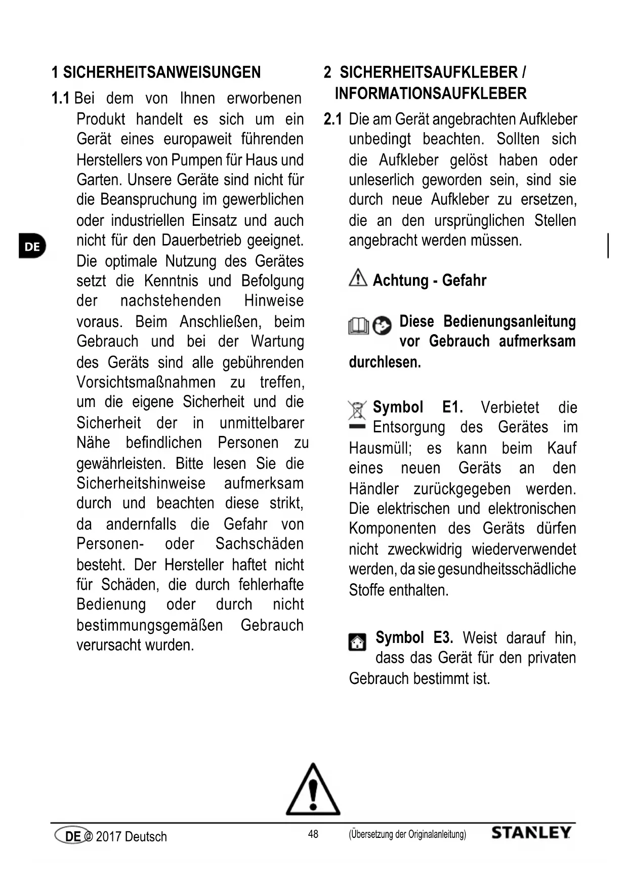 Die am Gerät angebrachten Aufkleber unbedingt beachten. Sollten sich die Aufkleber gelöst haben oder unleserlich geworden sein, sind sie durch neue Aufkleber zu ersetzen, die an den ursprünglichen Stellen angebracht werden müssen. Achtung - Gefahr Diese Bedienungsanleitung vor Gebrauch aufmerksam durchlesen. Symbol E1. Verbietet die Entsorgung des Gerätes im Hausmüll; es kann beim Kauf eines neuen Geräts an den Händler zurückgegeben werden. Die elektrischen und elektronischen Komponenten des Geräts dürfen nicht zweckwidrig wiederverwendet werden, da sie gesundheitsschädliche Stoffe enthalten. Symbol E3. Weist darauf hin, dass das Gerät für den privaten Gebrauch bestimmt ist.49 (Übersetzung der Originalanleitung) DE © 2017 Deutsch