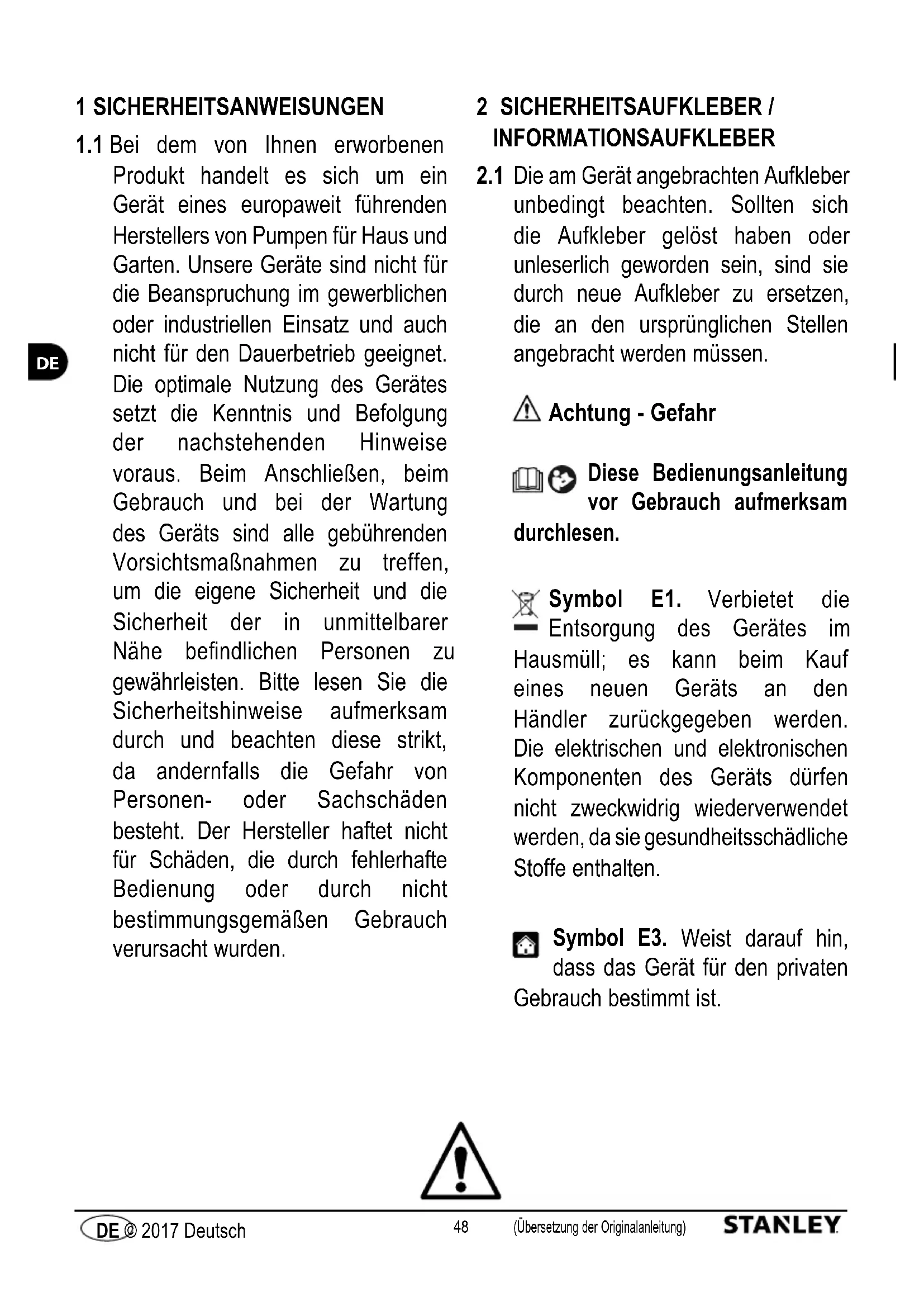 Die am Gerät angebrachten Aufkleber unbedingt beachten. Sollten sich die Aufkleber gelöst haben oder unleserlich geworden sein, sind sie durch neue Aufkleber zu ersetzen, die an den ursprünglichen Stellen angebracht werden müssen. Achtung - Gefahr Diese Bedienungsanleitung vor Gebrauch aufmerksam durchlesen. Symbol E1. Verbietet die Entsorgung des Gerätes im Hausmüll; es kann beim Kauf eines neuen Geräts an den Händler zurückgegeben werden. Die elektrischen und elektronischen Komponenten des Geräts dürfen nicht zweckwidrig wiederverwendet werden, da sie gesundheitsschädliche Stoffe enthalten. Symbol E3. Weist darauf hin, dass das Gerät für den privaten Gebrauch bestimmt ist.49 (Übersetzung der Originalanleitung) DE © 2017 Deutsch