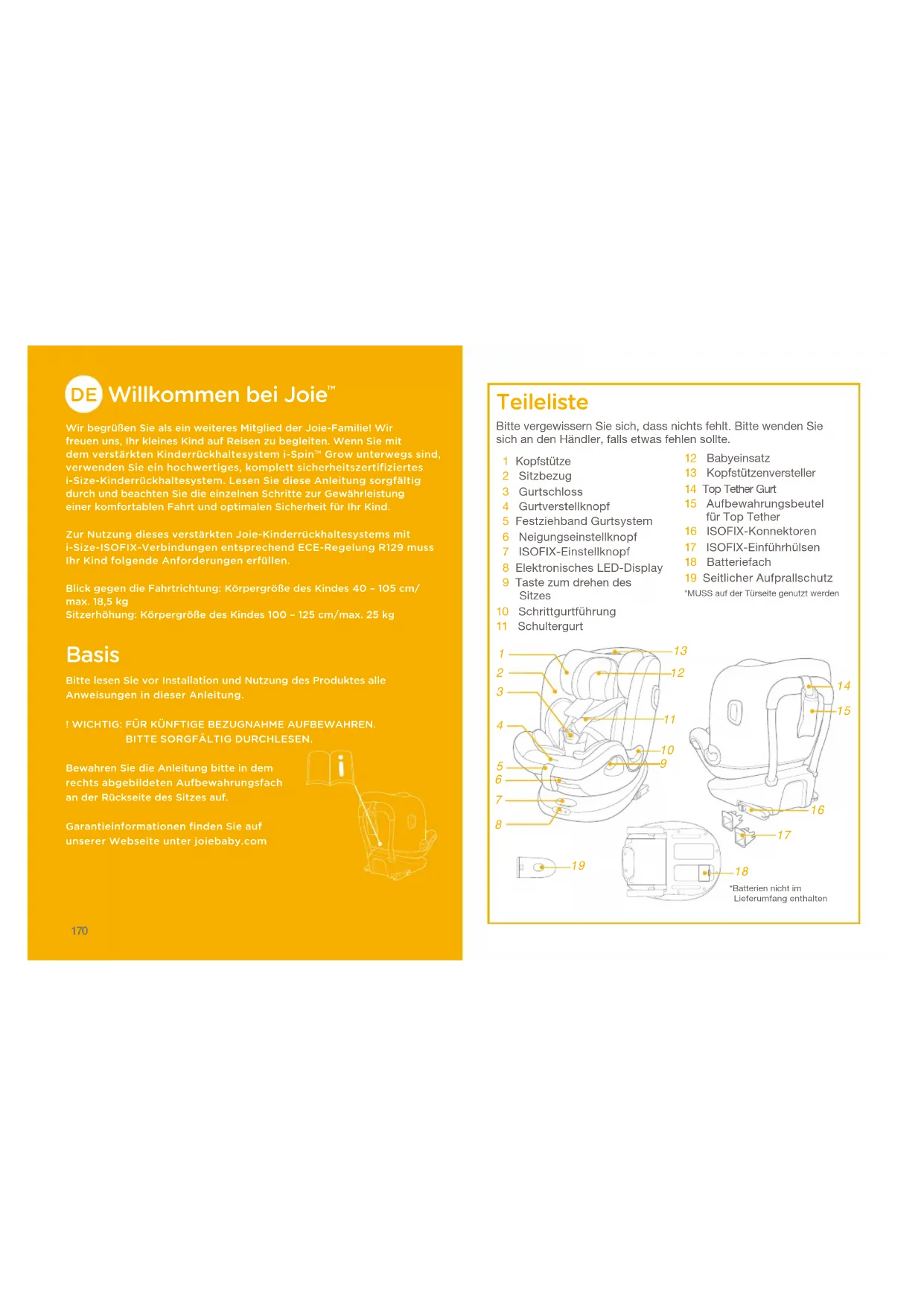 Wir begrüßen Sie als ein weiteres Mitglied der Joie-Familie! Wir freuen uns, Ihr kleines Kind auf Reisen zu begleiten. Wenn Sie mit dem verstärkten Kinderrückhaltesystem i-Spin™ Grow unterwegs sind, verwenden Sie ein hochwertiges, komplett sicherheitszertifiziertes i-Size-Kinderrückhaltesystem. Lesen Sie diese Anleitung sorgfältig durch und beachten Sie die einzelnen Schritte zur Gewährleistung einer komfortablen Fahrt und optimalen Sicherheit für Ihr Kind.Zur Nutzung dieses verstärkten Joie-Kinderrückhaltesystems mit i-Size-ISOFIX-Verbindungen entsprechend ECE-Regelung R129 muss Ihr Kind folgende Anforderungen erfüllen.Blick gegen die Fahrtrichtung: Körpergröße des Kindes 40 – 105 cm/max. 18,5 kgSitzerhöhung: Körpergröße des Kindes 100 – 125 cm/max. 25 kg Basis Bitte lesen Sie vor Installation und Nutzung des Produktes alle Anweisungen in dieser Anleitung.! WICHTIG: FÜR KÜNFTIGE BEZUGNAHME AUFBEWAHREN.BITTE SORGFÄLTIG DURCHLESEN.Bewahren Sie die Anleitung bitte in dem rechts abgebildeten Aufbewahrungsfach an der Rückseite des Sitzes auf.Garantieinformationen finden Sie auf unserer Webseite unter joiebaby.com Teileliste 1 Kopfstütze 2 Sitzbezug 3 Gurtschloss 4 Gurtverstellknopf 5 Festziehband Gurtsystem 6 Neigungseinstellknopf 7 ISOFIX-Einstellknopf 8 Elektronisches LED-Display 9 Taste zum drehen des Sitzes 10 Schrittgurtführung11 Schultergurt12 Babyeinsatz13 Kopfstützenversteller14 Top Tether Gurt15 Aufbewahrungsbeutel für Top Tether 16 ISOFIX-Konnektoren17 ISOFIX-Einführhülsen 18 Batteriefach19 Seitlicher AufprallschutzBitte vergewissern Sie sich, dass nichts fehlt. Bitte wenden Sie sich an den Händler, falls etwas fehlen sollte.