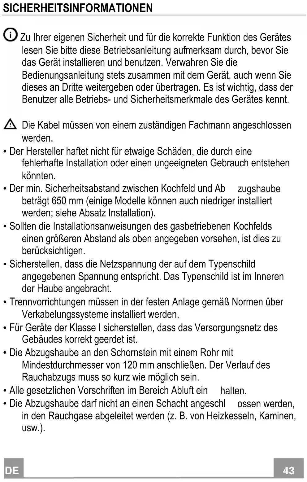 - Bei Anschluss der Haube an das Stromnetz muss ein zweipoliger Schalter mit einem Öffnungsweg von mindestens 3 mm zwischengeschaltet werden.