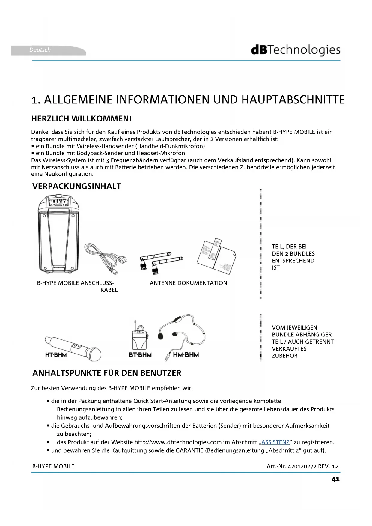 Art.-Nr. 420120272 REV. 1.2 Deutsch Das B-HYPE MOBILE System ist, ja nach erworbenem Bundle, mit einem Hand-Funkmikrofon (Handheld) oder Bodypack ausgestattet. Je nach Verfügbarkeit und Anwendungsland wird das System mit einer dieser drei Frequenzbändern verkauft: