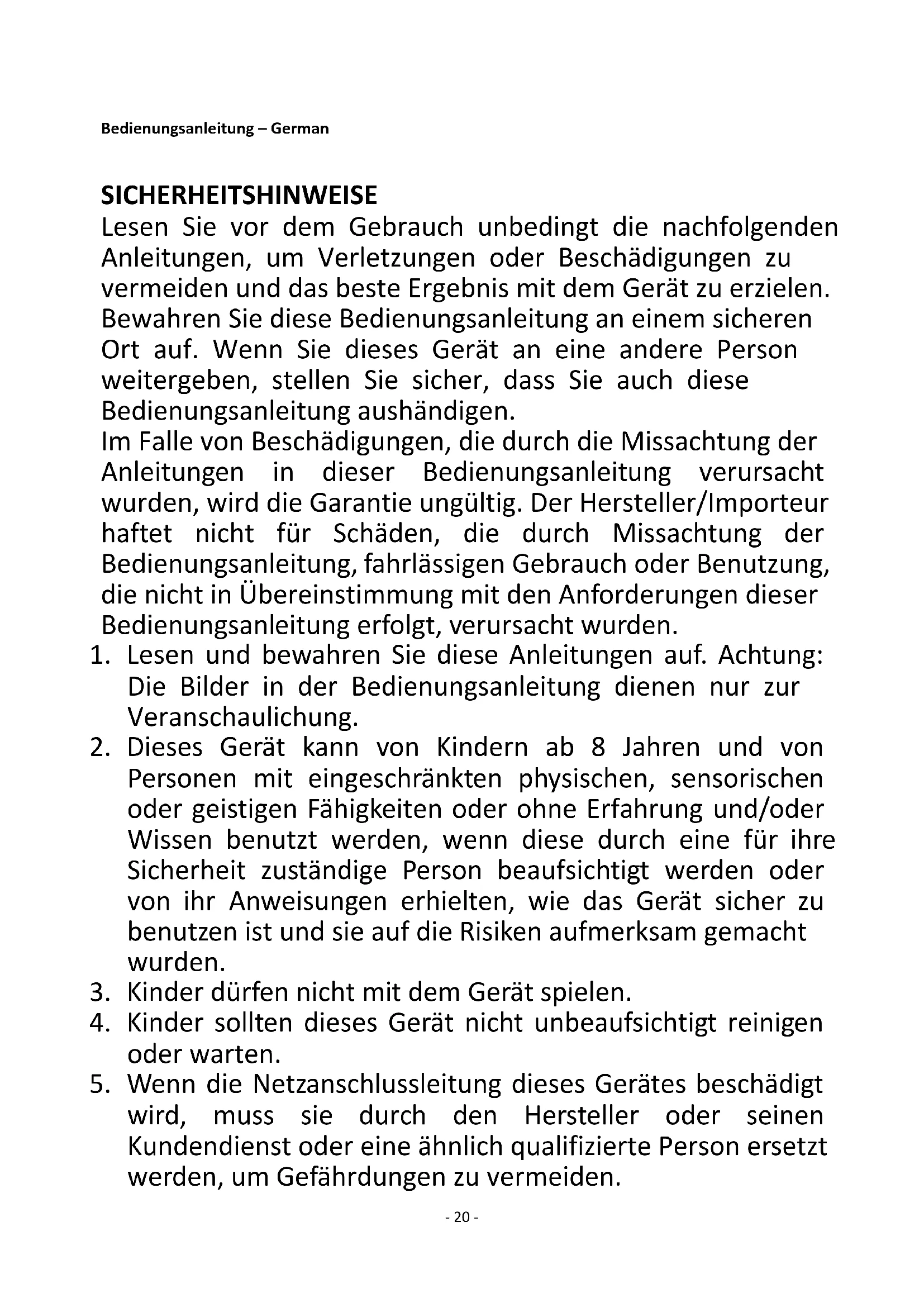 20. Das Gerät vor dem Reinigen oder Verstellen immer