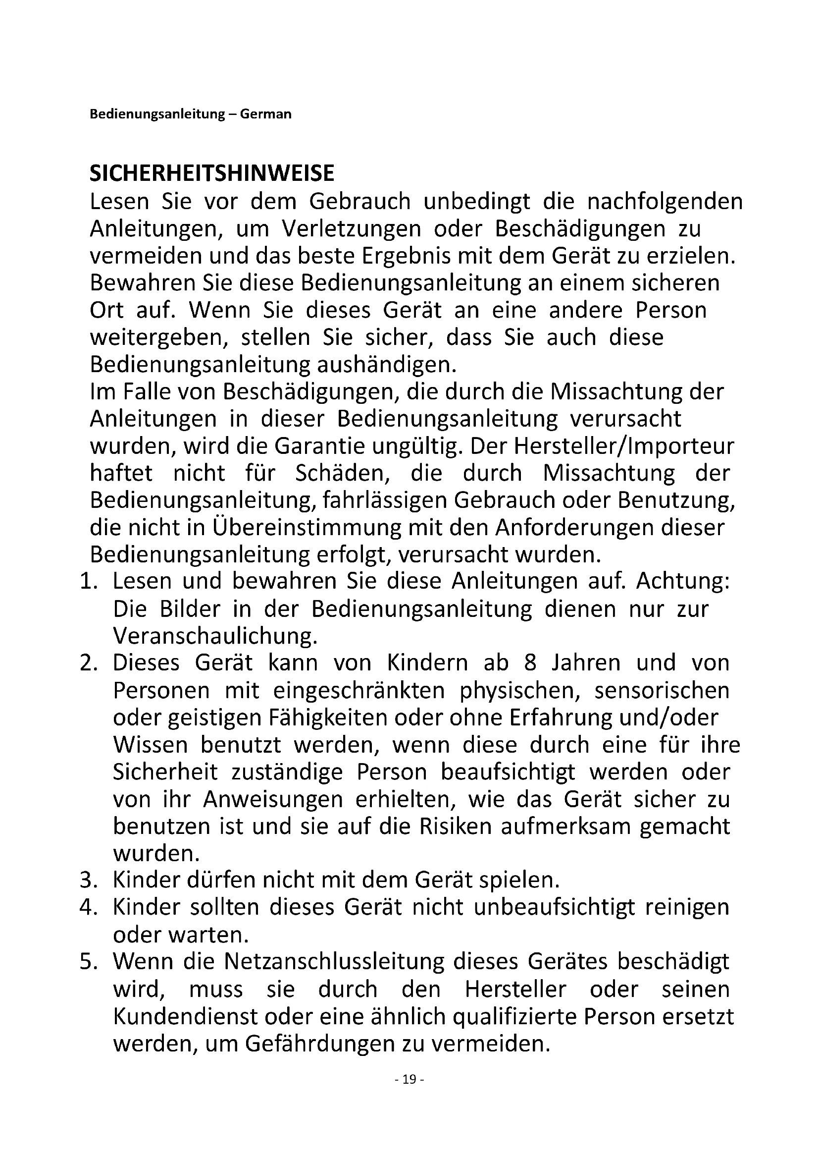 19. Das Gerät vor dem Reinigen oder Verstellen immer