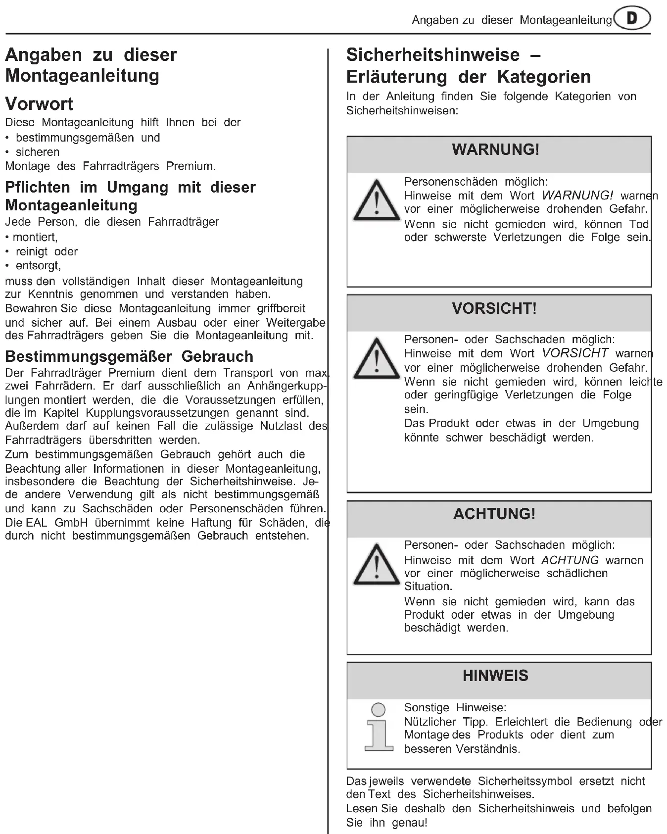- entsorgt, muss den vollständigen Inhalt dieser Montageanleitung zur Kenntnis genommen und verstanden haben. Bewahren Sie diese Montageanleitung immer griffbereit und sicher auf. Bei einem Ausbau oder einer Weitergabe des Fahrradträgers geben Sie die Montageanleitung mit. Bestimmungsgemäßer Gebrauch Der Fahrradträger Premium dient dem Transport von max. zwei Fahrrädern. Er darf ausschließlich an Anhängerkupp- lungen montiert werden, die die Voraussetzungen erfüllen, die im Kapitel Kupplungsvoraussetzungen genannt sind. Außerdem darf auf keinen Fall die zulässige Nutzlast des Fahrradträgers übersc hritten werden. Zum bestimmungsgemäßen Gebrauch gehört auch die Beachtung aller Informationen in dieser Montageanleitung, insbesondere die Beachtung der Sicherheitshinweise. Je- de andere Verwendung gilt als nicht bestimmungsgemäß und kann zu Sachschäden oder Personenschäden führen. Die EAL GmbH übernimmt keine Haftung für Schäden, die durch nicht bestimmungsgemäßen Gebrauch entstehen.4 WARNUNG! Personen- oder Sachschaden durch Verlieren der Fahrräder. Das Fahren ohne Sicherheitsgurte kann zu Unfällen führen.