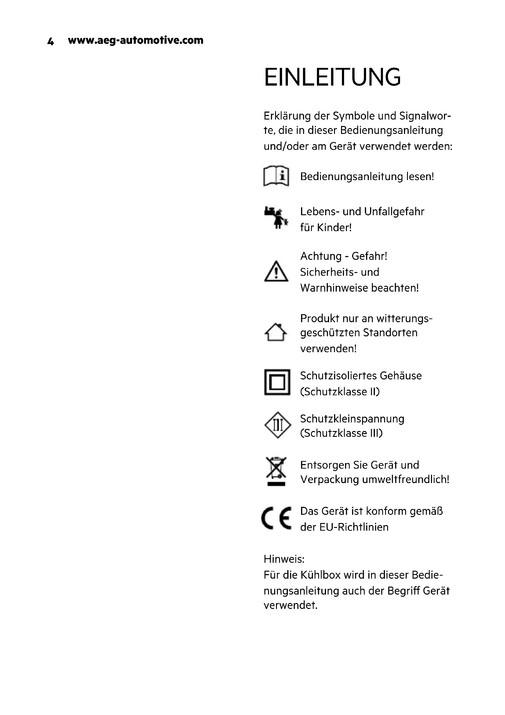 EINLEITUNG Erklärung der Symbole und Signalwor- te, die in dieser Bedienungsanleitung und/oder am Gerät verwendet werden: Bedienungsanleitung lesen! Lebens- und Unfallgefahr für Kinder! Achtung - Gefahr! Sicherheits- und Warnhinweise beachten! Produkt nur an witterungs- geschützten Standorten verwenden! Schutzisoliertes Gehäuse (Schutzklasse II) Schutzkleinspannung (Schutzklasse III) Entsorgen Sie Gerät und Verpackung umweltfreundlich! Das Gerät ist konform gemäß der EU-Richtlinien Hinweis: Für die Kühlbox wird in dieser Bedie- nungsanleitung auch der Begri Gerät verwendet.Deutsch 5 Bestimmungsgemäßer Gebrauch Die Kühlbox dient zum Kühlen von Lebensmitteln und Getränken. Die Küh- lung erfolgt über einen elektrothermi- schen Wandler (Peletierelement) durch einen Lüfter. Der Anschluss erfolgt über den Kfz-Stecker (12 V) oder über den 230 V Netzstecker. Das Gerät ist nicht bestimmt für Lage- rung und Transport von unverpackten Lebensmitteln. Dieses Gerät kann von Kindern ab einem Alter von acht (8) Jahren und von Personen mit eingeschränkten physischen, sensorischen oder geisti- gen Fähigkeiten oder einem Mangel an Erfahrung und/oder Wissen verwendet werden, wenn sie beaufsichtigt werden oder bezüglich des sicheren Gebrauchs des Geräts unterwiesen wurden und die daraus resultierenden Gefahren verstanden haben. Kinder dürfen nicht mit dem Gerät spielen. Reinigung und Benutzerwartung dürfen nicht durch Kinder ohne Beaufsichtigung durchge- führt werden. Das Gerät ist nicht für den gewerbli- chen Einsatz bestimmt. Jede andere Verwendung oder Veränderung des Geräts gilt als nicht bestimmungsgemäß und birgt erheb- liche Gefahren. Für Schäden, die aus bestimmungswidriger Verwendung ent- standen sind, übernimmt der Hersteller keine Haftung. Lieferumfang Kontrollieren Sie unmittelbar nach dem Auspacken den Lieferumfang. Prüfen Sie das Gerät sowie alle Teile auf Be- schädigungen. Nehmen Sie ein defektes Gerät oder Teile nicht in Betrieb.