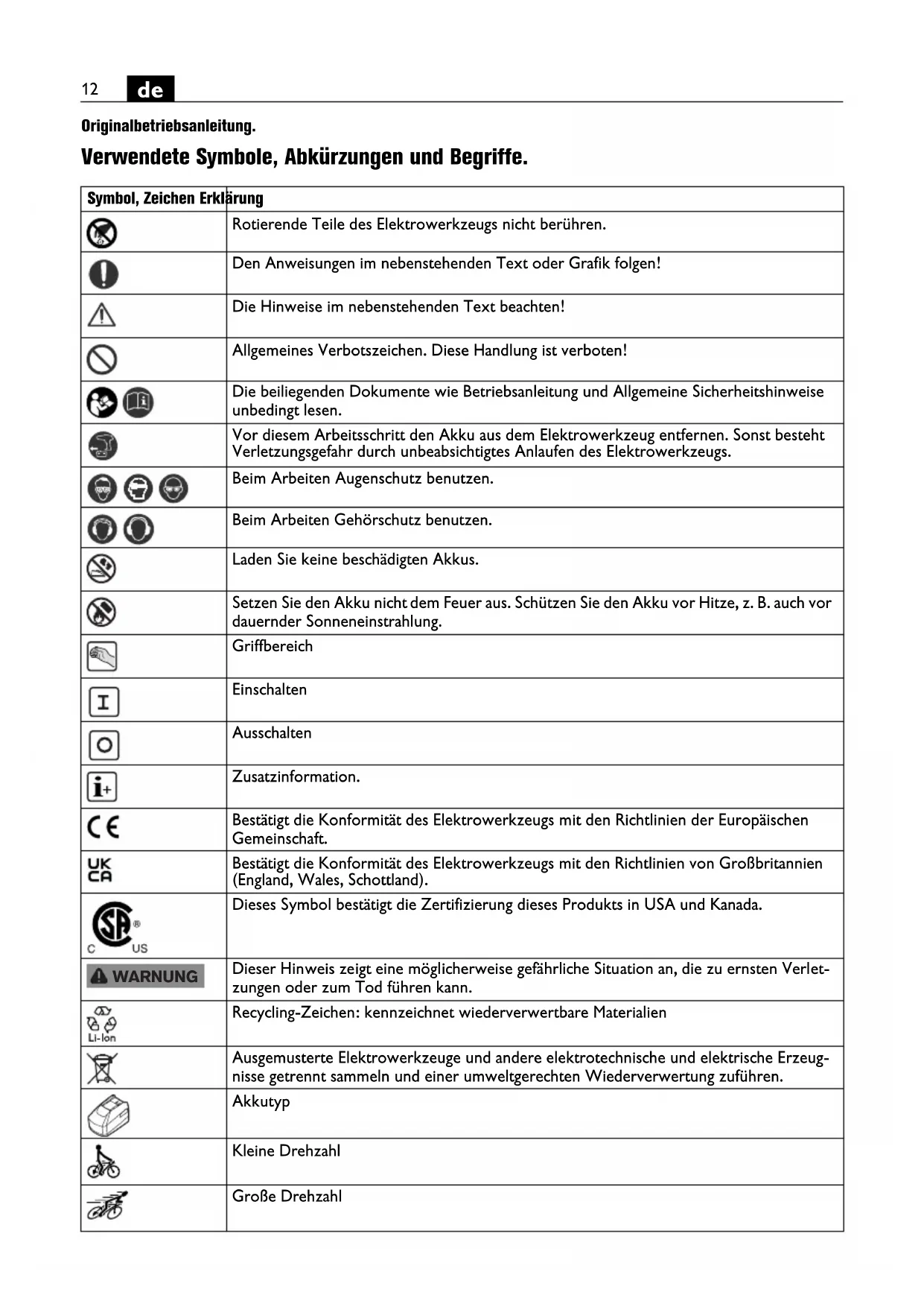Originalbetriebsanleitung.Übersetzung der Originalbetriebsanleitung. Verwendete Symbole, Abkürzungen und Begriffe. Symbol, Zeichen Erklärung Rotierende Teile des Elektrowerkzeugs nicht berühren. Den Anweisungen im nebenstehenden Text oder Grafik folgen! Die Hinweise im nebenstehenden Text beachten! Allgemeines Verbotszeichen. Diese Handlung ist verboten! Die beiliegenden Dokumente wie Betriebsanleitung und Allgemeine Sicherheitshinweise unbedingt lesen. Vor diesem Arbeitsschritt den Akku aus dem Elektrowerkzeug entfernen. Sonst besteht Verletzungsgefahr durch unbeabsichtigtes Anlaufen des Elektrowerkzeugs. Beim Arbeiten Augenschutz benutzen. Beim Arbeiten Gehörschutz benutzen. Laden Sie keine beschädigten Akkus. Setzen Sie den Akku nicht dem Feuer aus. Schützen Sie den Akku vor Hitze, z. B. auch vor dauernder Sonneneinstrahlung. Griffbereich Einschalten Ausschalten Zusatzinformation. Bestätigt die Konformität des Elektrowerkzeugs mit den Richtlinien der Europäischen Gemeinschaft. Bestätigt die Konformität des Elektrowerkzeugs mit den Richtlinien von Großbritannien (England, Wales, Schottland). Dieses Symbol bestätigt die Zertifizierung dieses Produkts in USA und Kanada. Dieser Hinweis zeigt eine möglicherweise gefährliche Situation an, die zu ernsten Verlet- zungen oder zum Tod führen kann. Recycling-Zeichen: kennzeichnet wiederverwertbare Materialien Ausgemusterte Elektrowerkzeuge und andere elektrotechnische und elektrische Erzeug- nisse getrennt sammeln und einer umweltgerechten Wiederverwertung zuführen. Akkutyp Kleine Drehzahl Große Drehzahl WARNUNG13