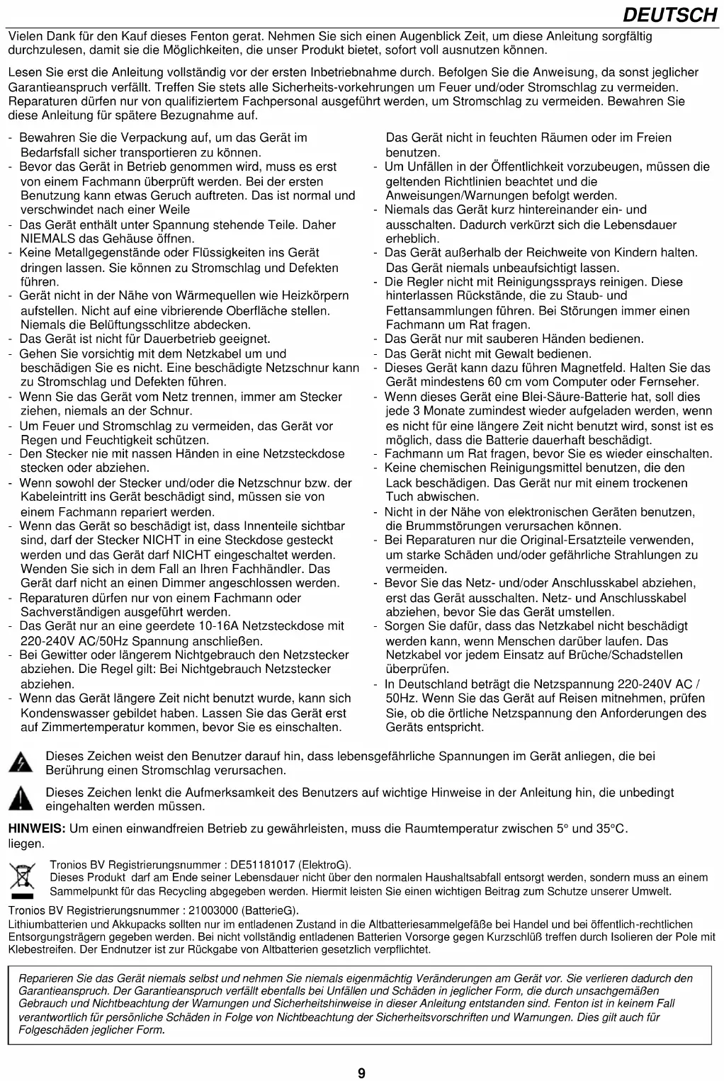Indien er om een wachtwoord wordt gevraagd, voer "0000" in. Opmerking: De BT heeft een bereik van ongeveer 10 meter zonder enkele barrière.9 DEUTSCH Vielen Dank für den Kauf dieses Fenton gerat. Nehmen Sie sich einen Augenblick Zeit, um diese Anleitung sorgfältig durchzulesen, damit sie die Möglichkeiten, die unser Produkt bietet, sofort voll ausnutzen können. Lesen Sie erst die Anleitung vollständig vor der ersten Inbetriebnahme durch. Befolgen Sie die Anweisung, da sonst jeglicher Garantieanspruch verfällt. Treffen Sie stets alle Sicherheits-vorkehrungen um Feuer und/oder Stromschlag zu vermeiden. Reparaturen dürfen nur von qualifiziertem Fachpersonal ausgeführt werden, um Stromschlag zu vermeiden. Bewahren Sie diese Anleitung für spätere Bezugnahme auf. - Bewahren Sie die Verpackung auf, um das Gerät im Bedarfsfall sicher transportieren zu können. - Bevor das Gerät in Betrieb genommen wird, muss es erst von einem Fachmann überprüft werden. Bei der ersten Benutzung kann etwas Geruch auftreten. Das ist normal und verschwindet nach einer Weile - Das Gerät enthält unter Spannung stehende Teile. Daher NIEMALS das Gehäuse öffnen. - Keine Metallgegenstände oder Flüssigkeiten ins Gerät dringen lassen. Sie können zu Stromschlag und Defekten führen. - Gerät nicht in der Nähe von Wärmequellen wie Heizkörpern aufstellen. Nicht auf eine vibrierende Oberfläche stellen. Niemals die Belüftungsschlitze abdecken. - Das Gerät ist nicht für Dauerbetrieb geeignet. - Gehen Sie vorsichtig mit dem Netzkabel um und beschädigen Sie es nicht. Eine beschädigte Netzschnur kann zu Stromschlag und Defekten führen. - Wenn Sie das Gerät vom Netz trennen, immer am Stecker ziehen, niemals an der Schnur. - Um Feuer und Stromschlag zu vermeiden, das Gerät vor Regen und Feuchtigkeit schützen. - Den Stecker nie mit nassen Händen in eine Netzsteckdose stecken oder abziehen. - Wenn sowohl der Stecker und/oder die Netzschnur bzw. der Kabeleintritt ins Gerät beschädigt sind, müssen sie von einem Fachmann repariert werden. - Wenn das Gerät so beschädigt ist, dass Innenteile sichtbar sind, darf der Stecker NICHT in eine Steckdose gesteckt werden und das Gerät darf NICHT eingeschaltet werden. Wenden Sie sich in dem Fall an Ihren Fachhändler. Das Gerät darf nicht an einen Dimmer angeschlossen werden. - Reparaturen dürfen nur von einem Fachmann oder Sachverständigen ausgeführt werden. - Das Gerät nur an eine geerdete 10-16A Netzsteckdose mit 220-240V AC/50Hz Spannung anschließen. - Bei Gewitter oder längerem Nichtgebrauch den Netzstecker abziehen. Die Regel gilt: Bei Nichtgebrauch Netzstecker abziehen. - Wenn das Gerät längere Zeit nicht benutzt wurde, kann sich Kondenswasser gebildet haben. Lassen Sie das Gerät erst auf Zimmertemperatur kommen, bevor Sie es einschalten. Das Gerät nicht in feuchten Räumen oder im Freien benutzen. - Um Unfällen in der Öffentlichkeit vorzubeugen, müssen die geltenden Richtlinien beachtet und die Anweisungen/Warnungen befolgt werden. - Niemals das Gerät kurz hintereinander ein- und ausschalten. Dadurch verkürzt sich die Lebensdauer erheblich. - Das Gerät außerhalb der Reichweite von Kindern halten. Das Gerät niemals unbeaufsichtigt lassen. - Die Regler nicht mit Reinigungssprays reinigen. Diese hinterlassen Rückstände, die zu Staub- und Fettansammlungen führen. Bei Störungen immer einen Fachmann um Rat fragen. - Das Gerät nur mit sauberen Händen bedienen. - Das Gerät nicht mit Gewalt bedienen. - Dieses Gerät kann dazu führen Magnetfeld. Halten Sie das Gerät mindestens 60 cm vom Computer oder Fernseher. - Wenn dieses Gerät eine Blei-Säure-Batterie hat, soll dies jede 3 Monate zumindest wieder aufgeladen werden, wenn es nicht für eine längere Zeit nicht benutzt wird, sonst ist es möglich, dass die Batterie dauerhaft beschädigt. - Fachmann um Rat fragen, bevor Sie es wieder einschalten. - Keine chemischen Reinigungsmittel benutzen, die den Lack beschädigen. Das Gerät nur mit einem trockenen Tuch abwischen. - Nicht in der Nähe von elektronischen Geräten benutzen, die Brummstörungen verursachen können. - Bei Reparaturen nur die Original-Ersatzteile verwenden, um starke Schäden und/oder gefährliche Strahlungen zu vermeiden. - Bevor Sie das Netz- und/oder Anschlusskabel abziehen, erst das Gerät ausschalten. Netz- und Anschlusskabel abziehen, bevor Sie das Gerät umstellen. - Sorgen Sie dafür, dass das Netzkabel nicht beschädigt werden kann, wenn Menschen darüber laufen. Das Netzkabel vor jedem Einsatz auf Brüche/Schadstellen überprüfen. - In Deutschland beträgt die Netzspannung 220-240V AC / 50Hz. Wenn Sie das Gerät auf Reisen mitnehmen, prüfen Sie, ob die örtliche Netzspannung den Anforderungen des Geräts entspricht. Dieses Zeichen weist den Benutzer darauf hin, dass lebensgefährliche Spannungen im Gerät anliegen, die bei Berührung einen Stromschlag verursachen. Dieses Zeichen lenkt die Aufmerksamkeit des Benutzers auf wichtige Hinweise in der Anleitung hin, die unbedingt eingehalten werden müssen. HINWEIS: Um einen einwandfreien Betrieb zu gewährleisten, muss die Raumtemperatur zwischen 5° und 35°C. liegen. Tronios BV Registrierungsnummer : DE51181017 (ElektroG). Dieses Produkt darf am Ende seiner Lebensdauer nicht über den normalen Haushaltsabfall entsorgt werden, sondern muss an einem Sammelpunkt für das Recycling abgegeben werden. Hiermit leisten Sie einen wichtigen Beitrag zum Schutze unserer Umwelt. Tronios BV Registrierungsnummer : 21003000 (BatterieG). Lithiumbatterien und Akkupacks sollten nur im entladenen Zustand in die Altbatteriesammelgefäße bei Handel und bei öffentlich-rechtlichen Entsorgungsträgern gegeben werden. Bei nicht vollständig entladenen Batterien Vorsorge gegen Kurzschlüß treffen durch Isolieren der Pole mit Klebestreifen. Der Endnutzer ist zur Rückgabe von Altbatterien gesetzlich verpflichtet.