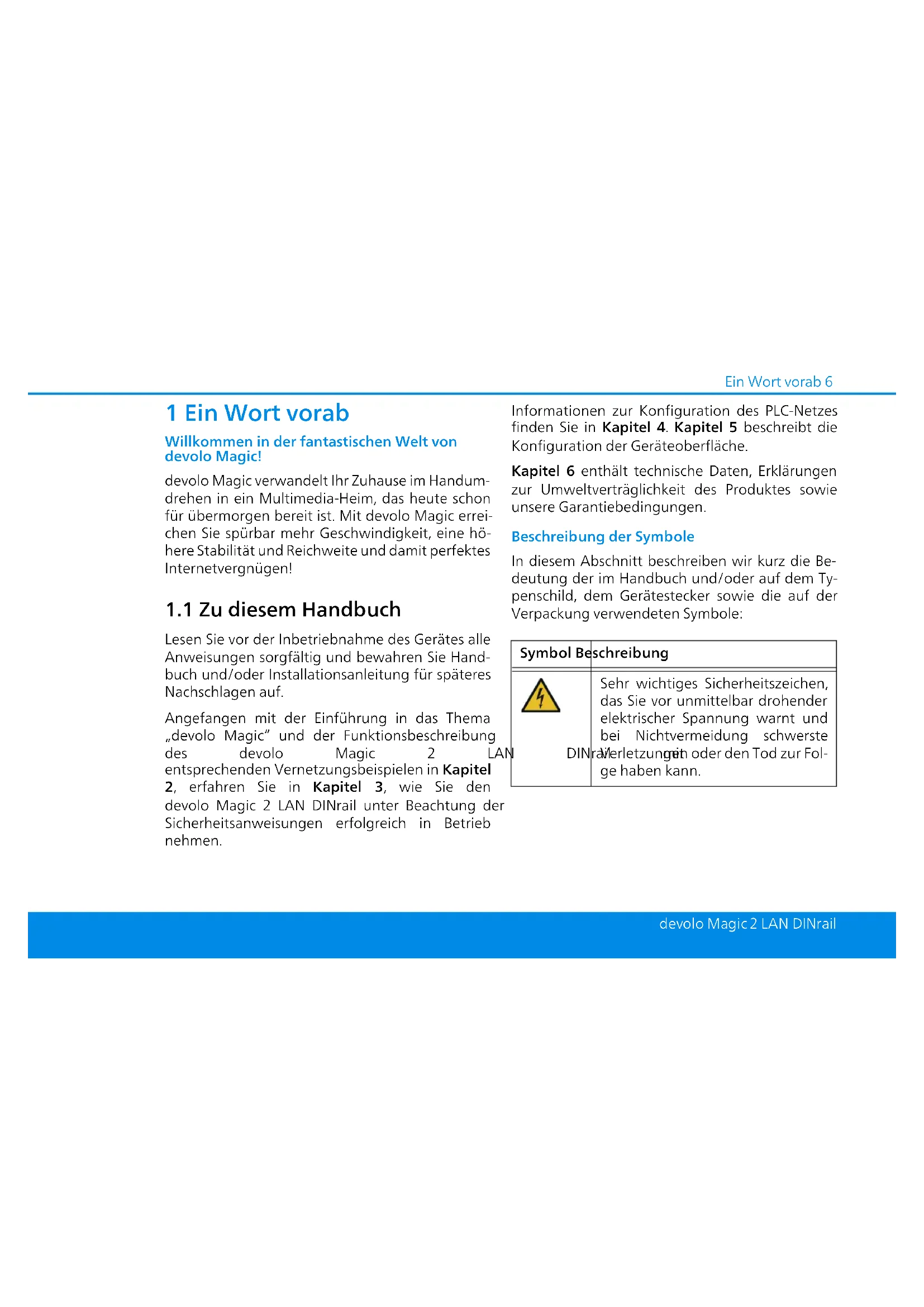 Lesen Sie vor der Inbetriebnahme des Gerätes alle Anweisungen sorgfältig und bewahren Sie Hand- buch und/oder Installationsanleitung für späteres Nachschlagen auf. Angefangen mit der Einführung in das Thema „devolo Magic“ und der Funktionsbeschreibung des devolo Magic 2 LAN DINrail mit entsprechenden Vernetzungsbeispielen in Kapitel 2, erfahren Sie in Kapitel 3, wie Sie den devolo Magic 2 LAN DINrail unter Beachtung der Sicherheitsanweisungen erfolgreich in Betrieb nehmen. Informationen zur Konfiguration des PLC-Netzes finden Sie in Kapitel 4. Kapitel 5 beschreibt die Konfiguration der Geräteoberfläche. Kapitel 6 enthält technische Daten, Erklärungen zur Umweltverträglichkeit des Produktes sowie unsere Garantiebedingungen. Beschreibung der Symbole In diesem Abschnitt beschreiben wir kurz die Be- deutung der im Handbuch und/oder auf dem Ty- penschild, dem Gerätestecker sowie die auf der Verpackung verwendeten Symbole: Symbol Beschreibung Sehr wichtiges Sicherheitszeichen, das Sie vor unmittelbar drohender elektrischer Spannung warnt und bei Nichtvermeidung schwerste Verletzungen oder den Tod zur Fol- ge haben kann.7 Ein Wort vorab devolo Magic 2 LAN DINrail Sehr wichtiges Sicherheitszeichen, das Sie vor einer unmittelbar dro- henden Gefahr warnt und bei Nichtvermeidung schwerste Verlet- zungen oder den Tod zur Folge ha- ben kann. Wichtiges Sicherheitszeichen, das Sie vor einer möglicherweise ge- fährlichen Situation eines Hinder- nisses am Boden warnt und bei Nichtbeachtung Verletzungen zur Folge haben kann. Die Installation des Gerätes darf nur durch eine Elektrofachkraft mit entsprechender Qualifikation erfol- gen. Wichtiger Hinweis, dessen Beach- tung empfehlenswert ist und bei Nichtbeachtung möglicherweise zu Sachschäden führen kann. Das Gerät darf nur in trockenen und geschlossenen Räumen ver- wendet werden. Symbol Beschreibung Mit der CE-Kennzeichnung erklärt der Hersteller/Inverkehrbringer, dass das Produkt allen geltenden europäischen Vorschriften ent- spricht und es den vorgeschrieben- en Konformitätsbewertungsver- fahren unterzogen wurde. Dient der Vermeidung von Abfällen von Elektro- und Elektronikgeräten und der Reduzierung solcher Abfäl- le durch Wiederverwendung, Recy- cling und andere Formen der Verwertung. Die WEEE-Richtlinie legt Mindestnormen für die Be- handlung von Elektro- und Elektro- nik-Altgeräten in der EU, EFTA und UK fest. Zusätzliche Informationen und Tipps zu Hintergründen und zur Konfiguration Ihres Gerätes. Kennzeichnet den abgeschlossen- en Handlungsverlauf Symbol BeschreibungEin Wort vorab 8 devolo Magic 2 LANDINrail
