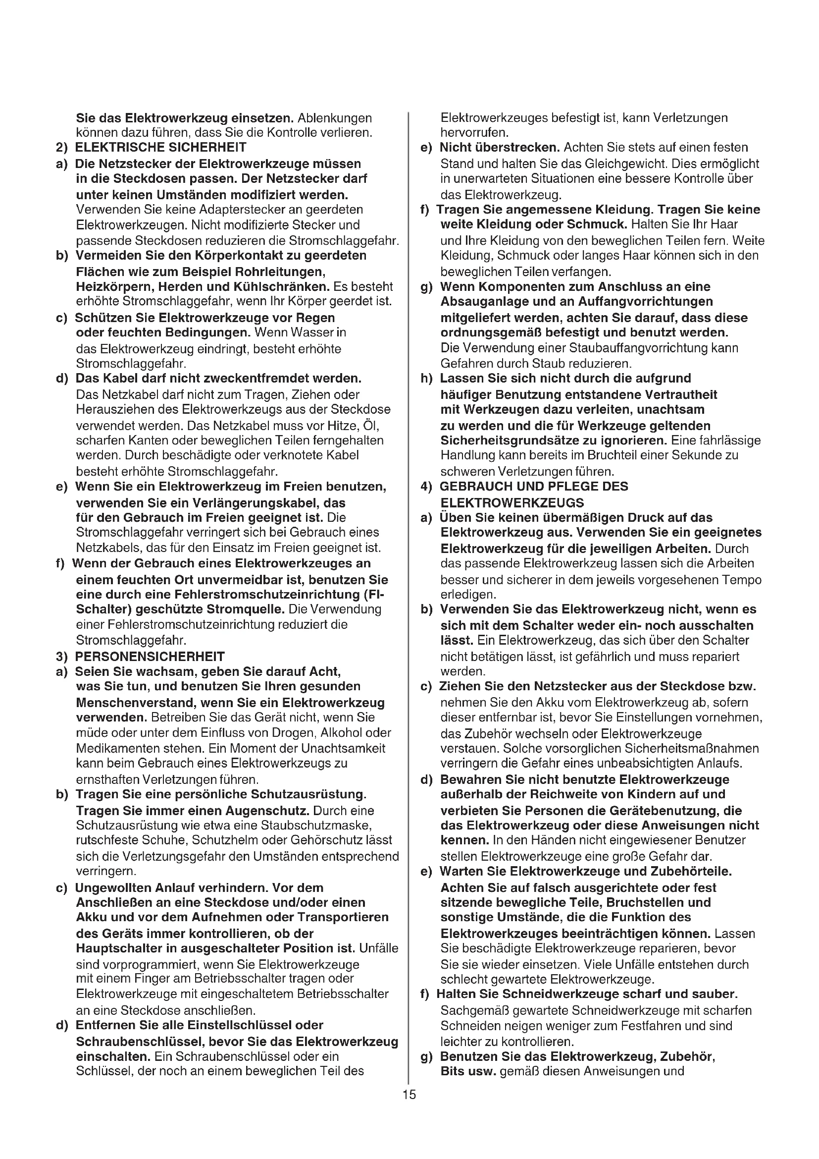 ELEKTROWERKZEUGEN - WARNUNG Beachten Sie alle Warnhinweise, Anweisungen, Abbildungen und technischen Daten, die diesem Elektrowerkzeug beigefügt sind. Die Nichtbeachtung der unten aufgeführten Anweisungen kann zu Stromschlägen, Bränden und/oder schweren Verletzungen führen. Bewahren Sie alle Warn- und Bedienhinweise für Nachschlagezwecke auf. Unter den Begri „Elektrowerkzeug“ in den Warnhinweisen fallen netzbetriebene (d. h. kabelgebundene) oder akkubetriebene (d.h. kabellose) Elektrowerkzeuge.
