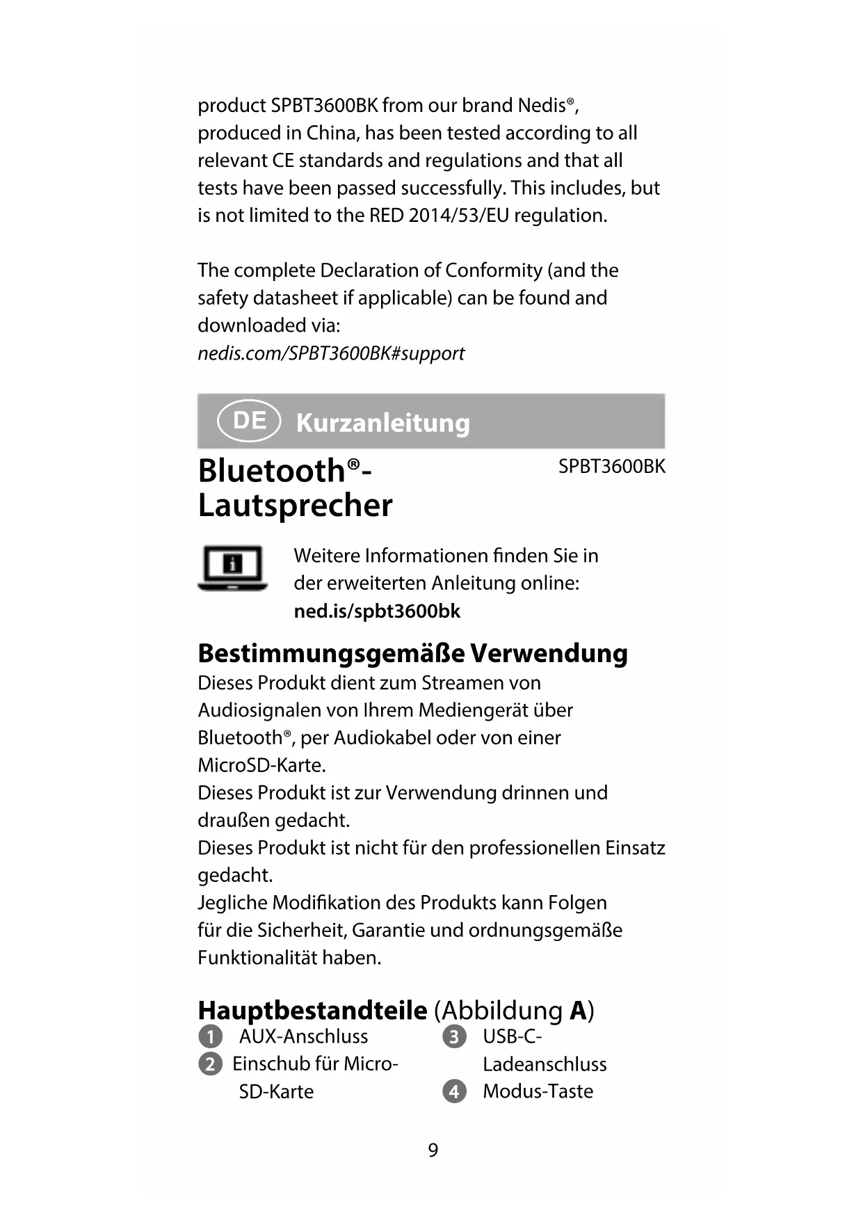 Kurzanleitung Bluetooth®- Lautsprecher SPBT3600BK Weitere Informationen nden Sie in der erweiterten Anleitung online: ned.is/spbt3600bk Bestimmungsgemäße Verwendung Dieses Produkt dient zum Streamen von Audiosignalen von Ihrem Mediengerät über Bluetooth®, per Audiokabel oder von einer MicroSD-Karte. Dieses Produkt ist zur Verwendung drinnen und draußen gedacht. Dieses Produkt ist nicht für den professionellen Einsatz gedacht. Jegliche Modikation des Produkts kann Folgen für die Sicherheit, Garantie und ordnungsgemäße Funktionalität haben. Hauptbestandteile (Abbildung A) 1 AUX-Anschluss 2 Einschub für Micro- SD-Karte 3 USB-C- Ladeanschluss 4 Modus-Taste10 5 Lautstärke erhöhen / nächster Titel Taste 6 Play/Pause-Taste 7 Lautstärke verringern / vorheriger Titel Taste 8 Ein/Aus-Taste 9 Anzeige-LED q USB – USB-C Ladekabel Sicherheitshinweise