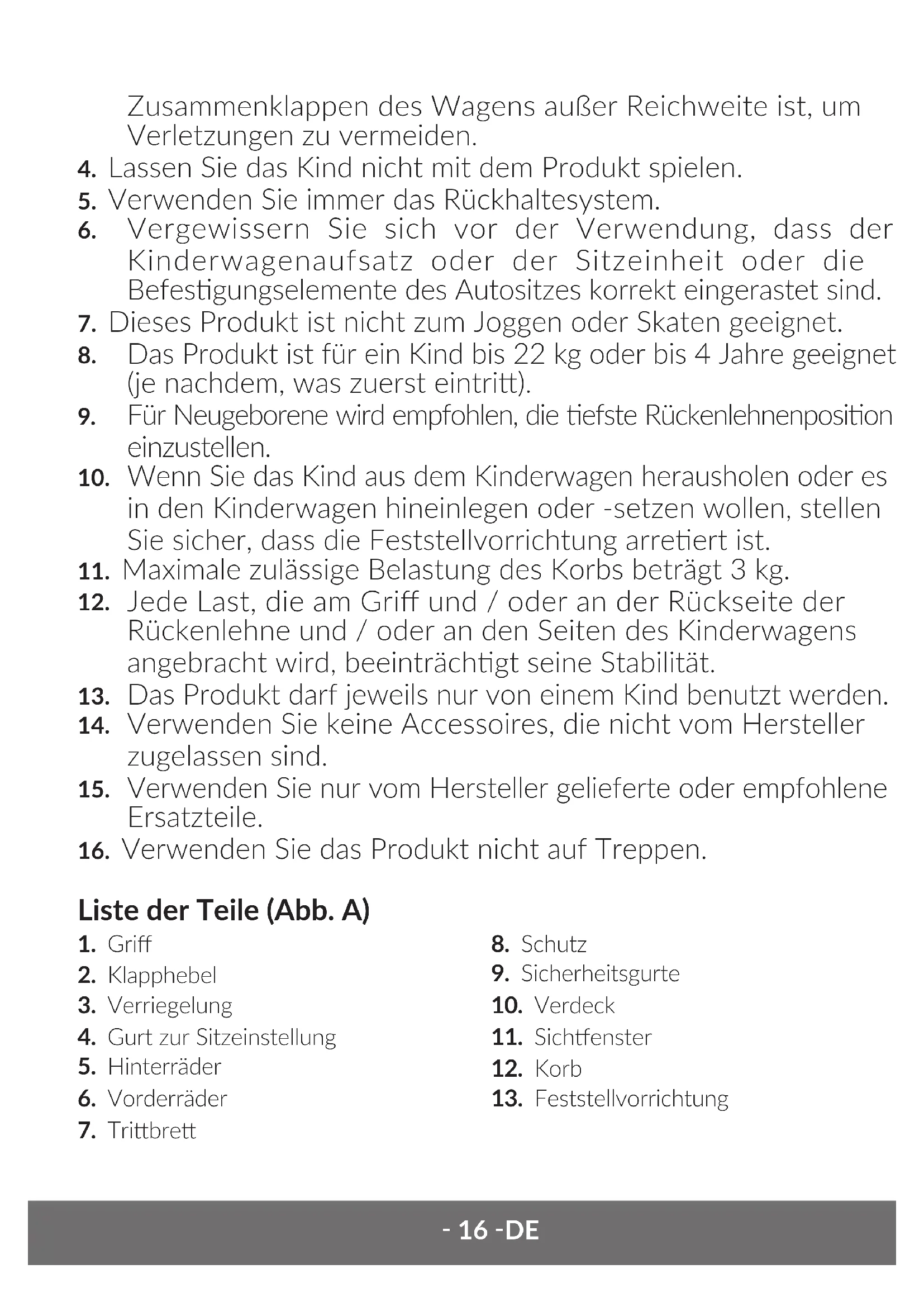 - Überprüfen Sie regelmäßig den Zustand des Kinderwagens und der Räder. Verwenden Sie kein Zubehör, das nicht im Set enthalten ist Verwenden Sie nur Originalersatzteile.