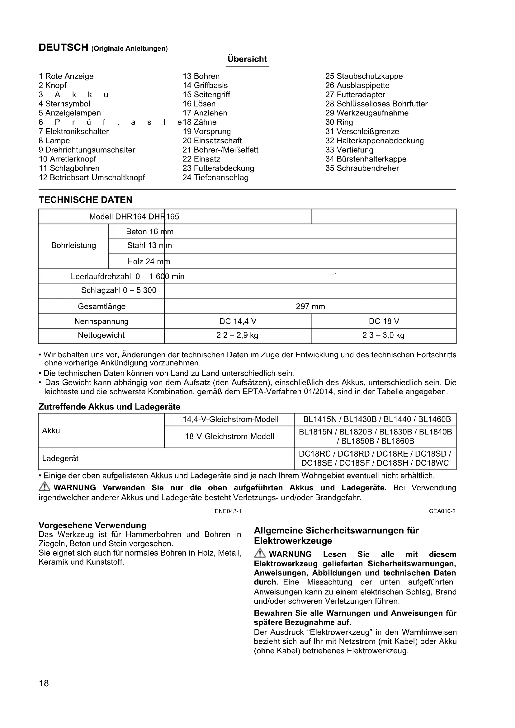 - Einige der oben aufgelisteten Akkus und Ladegeräte sind je nach Ihrem Wohngebiet eventuell nicht erhältlich. WARNUNG Verwenden Sie nur die oben aufgeführten Akkus und Ladegeräte. Bei Verwendung irgendwelcher anderer Akkus und Ladegeräte besteht Verletzungs- und/oder Brandgefahr. ENE042-1 Vorgesehene Verwendung Das Werkzeug ist für Hammerbohren und Bohren in Ziegeln, Beton und Stein vorgesehen. Sie eignet sich auch für normales Bohren in Holz, Metall, Keramik und Kunststoff. GEA010-2 Allgemeine Sicherheitswarnungen für Elektrowerkzeuge WARNUNG Lesen Sie alle mit diesem Elektrowerkzeug gelieferten Sicherheitswarnungen, Anweisungen, Abbildungen und technischen Daten durch. Eine Missachtung der unten aufgeführten Anweisungen kann zu einem elektrischen Schlag, Brand und/oder schweren Verletzungen führen. Bewahren Sie alle Warnungen und Anweisungen für spätere Bezugnahme auf. Der Ausdruck “Elektrowerkzeug” in den Warnhinweisen bezieht sich auf Ihr mit Netzstrom (mit Kabel) oder Akku (ohne Kabel) betriebenes Elektrowerkzeug. Modell DHR164 DHR165 Bohrleistung Beton 16 mm Stahl 13 mm Holz 24 mm Leerlaufdrehzahl 0 – 1 600 min