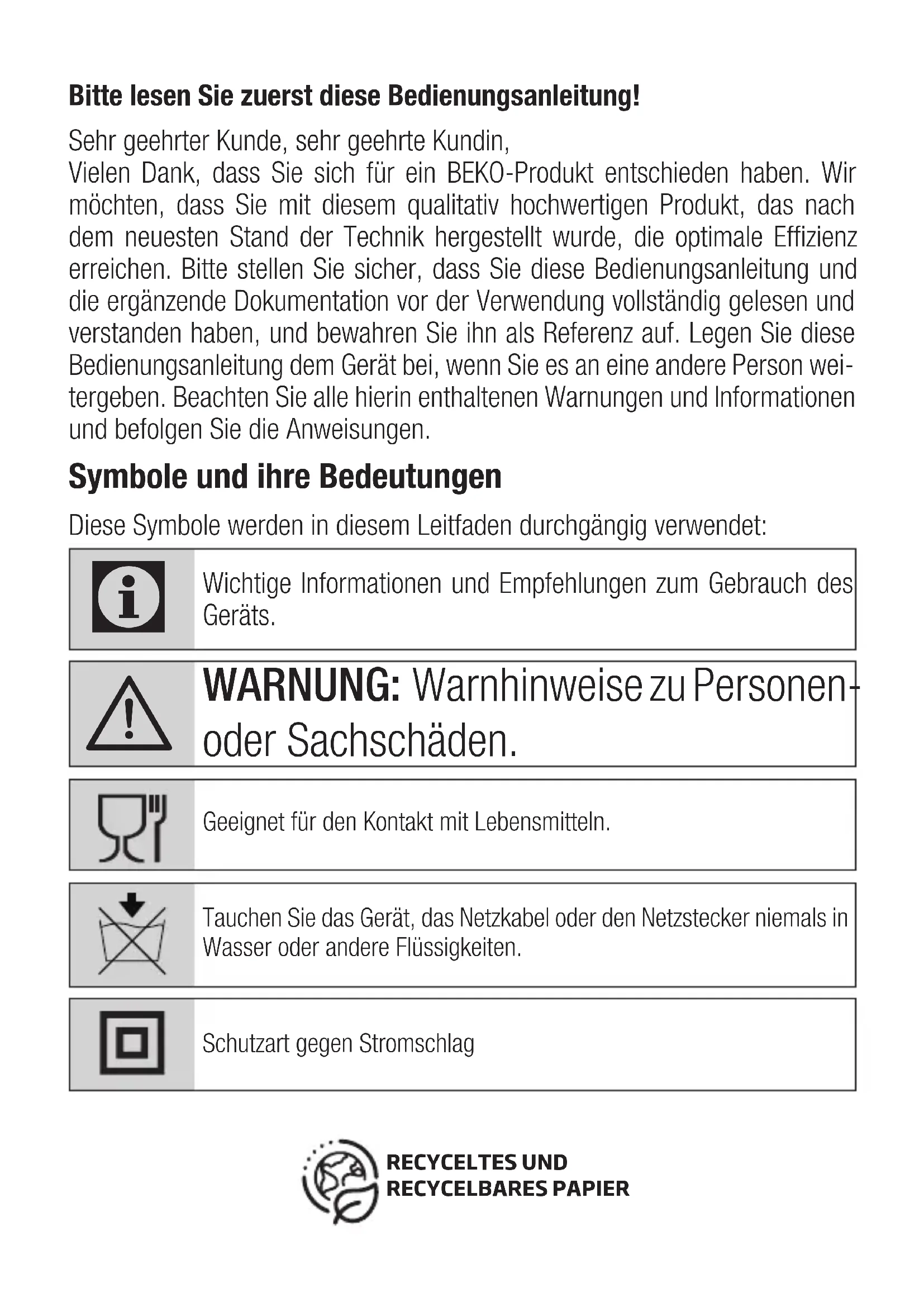 - If the appliance is dropped, the appliance may not operate or permanent damage may occur.Bitte lesen Sie zuerst diese Bedienungsanleitung! Sehr geehrter Kunde, sehr geehrte Kundin, Vielen Dank, dass Sie sich für ein BEKO-Produkt entschieden haben. Wir möchten, dass Sie mit diesem qualitativ hochwertigen Produkt, das nach dem neuesten Stand der Technik hergestellt wurde, die optimale Effizienz erreichen. Bitte stellen Sie sicher, dass Sie diese Bedienungsanleitung und die ergänzende Dokumentation vor der Verwendung vollständig gelesen und verstanden haben, und bewahren Sie ihn als Referenz auf. Legen Sie diese Bedienungsanleitung dem Gerät bei, wenn Sie es an eine andere Person wei- tergeben. Beachten Sie alle hierin enthaltenen Warnungen und Informationen und befolgen Sie die Anweisungen. Symbole und ihre Bedeutungen Diese Symbole werden in diesem Leitfaden durchgängig verwendet: