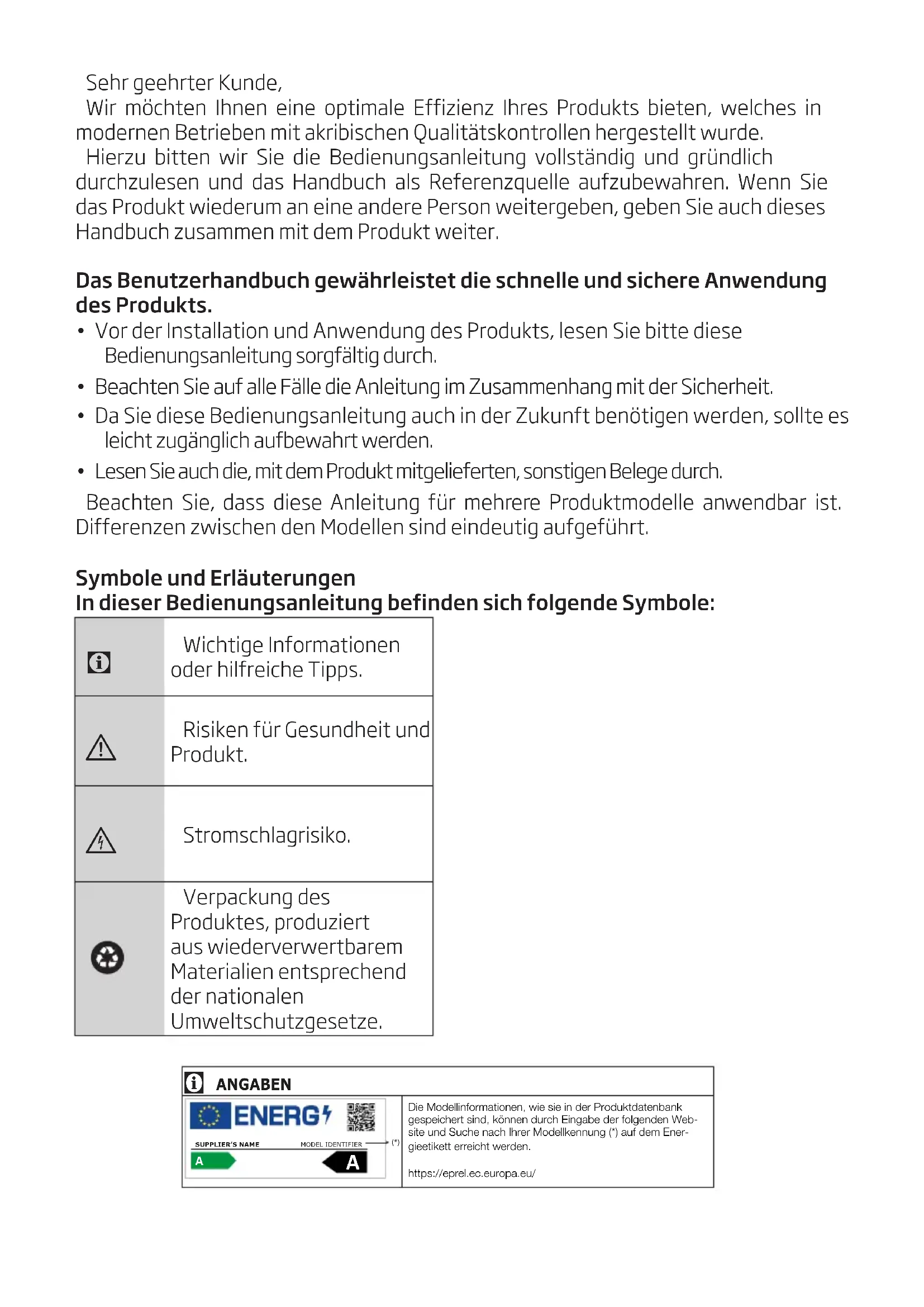Die Modellinformationen, wie sie in der Produktdatenbank gespeichert sind, können durch Eingabe der folgenden Web-site und Suche nach Ihrer Modellkennung (*) auf dem Ener-gieetikett erreicht werden.https://eprel.ec.europa.eu/