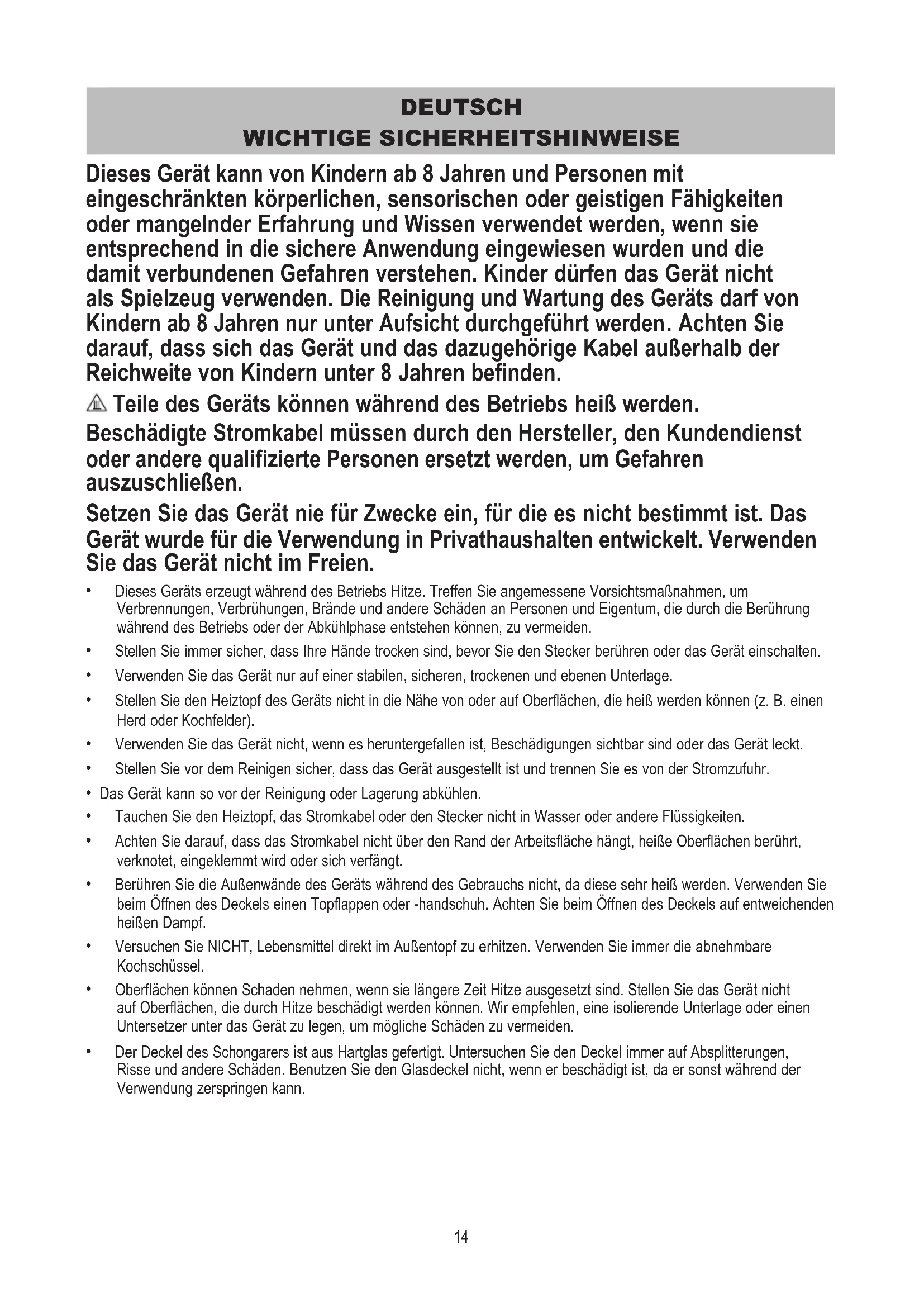 - Tragen Sie immer Topfhandschuhe, wenn Sie den Deckel oder Steinguttopf berühren. Achten Sie beim Öffnen des Deckels auf entweichenden heißen Dampf.