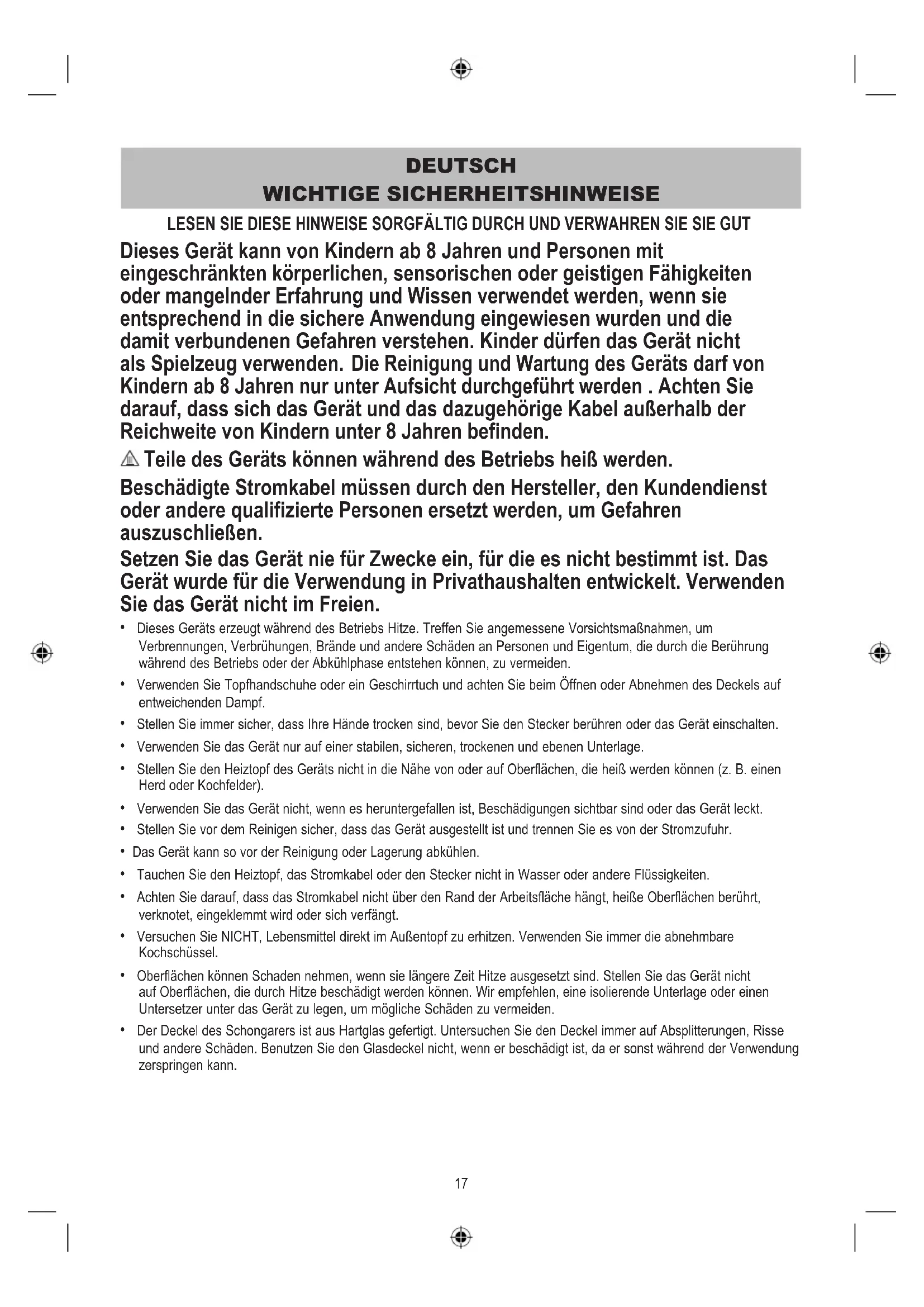 - Tauchen Sie den Heiztopf, das Stromkabel oder den Stecker nicht in Wasser oder andere Flüssigkeiten.