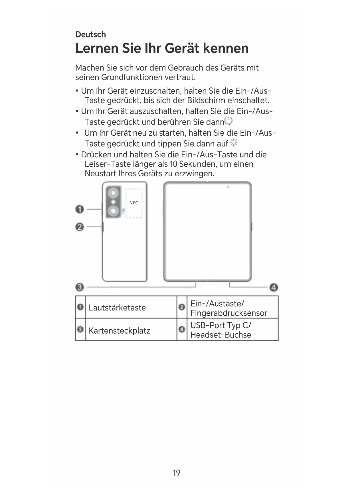 Lautstärketaste Ein-/Austaste/ Fingerabdrucksensor Kaensteckplatz USB-Po Typ C/ Headset-Buchse 19• Halten Sie den NFC-Bereich während der Verwendung der NFC-Funktion nahe an andere Geräte oder Gegenstände.