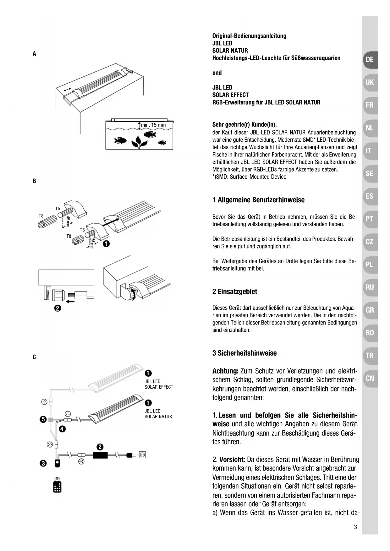 Der Ausfall von bis zu 5 % der Einzel-LEDs innerhalb der Garan- tiezeit gilt nicht als Produktmangel. Die Garantie umfasst die Reparatur nach unserer Wahl durch Er- satz (kostenlose Lieferung eines gleichwertigen Produktes) oder dessen Instandsetzung nach den technischen Erfordernissen. Für die aufgrund der Garantie instandgesetzten oder ersetzten Teile gilt die verbleibende Garantiezeit. Die Garantie umfasst nicht den Ersatz von unmittelbaren oder mittelbaren Folgeschäden. Die Garantie gilt ausschließlich für Verkäufe an Kunden inner- halb der Europäischen Union. Die Garantie erlischt, wenn das Produkt von dem Kunden oder Dritten nicht fachgerecht montiert, gewartet oder gereinigt wur- de, vorsätzlich beschädigt sowie in irgendeiner Weise nicht be- stimmungsgemäß verändert wurde. Innerhalb der Garantiedauer wenden Sie sich unter Vorlage ei- nes gültigen Kaufbelegs an Ihren Verkäufer oder kontaktieren Sie uns unter https://www.jbl.de/support/ Original operating instructions JBL LED SOLAR NATUR High-performance LED Light for Freshwater Aquariums and JBL LED SOLAR EFFECT RGB Extension for JBL LED SOLAR NATUR Dear Customer, Congratulations on your purchase of this JBL LED SOLAR NA- TUR aquarium light. State of the art SMD* LED technology pro- vides the best light for plant growth in the aquarium and brings out the natural colouring of your fish. With JBL LED SOLAR EF- FECT, available separately, you also have the opportunity to add coloured highlights using RBG LEDs. *)SMD: Surface-Mounted Device 1 General user instructions Before using this appliance please read and understand these operating instructions completely. The operating instructions are a part of the product. Keep them within easy reach. Please also hand over the operating instructions when passing the device over to a third party. 2 Application This appliance is suitable only for lighting aquariums in private households. The instructions described in the following parts of the operating manual must be followed. 3 Safety Instructions Please note: Basic safety precautions including the following must be observed to protect you from injury and electric shock: