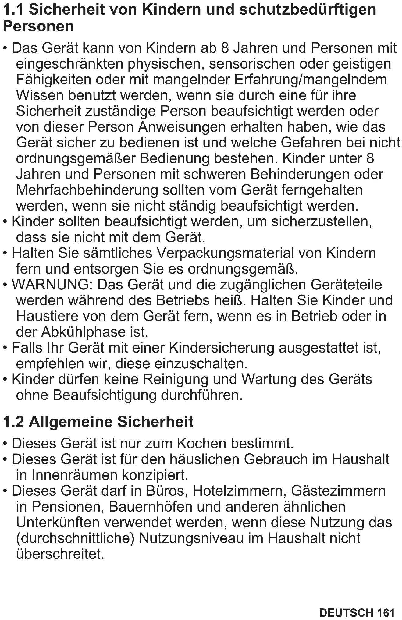 Lesen Sie vor der Montage und dem Gebrauch des Geräts zuerst die Bedienungsanleitung. Bei Verletzungen oder Schäden infolge nicht ordnungsgemäßer Montage oder Verwendung übernimmt der Hersteller keine Haftung. Bewahren Sie die Anleitung zum Nachschlagen an einem sicheren und zugänglichen Ort auf. 160 DEUTSCH1.1 Sicherheit von Kindern und schutzbedürftigen Personen