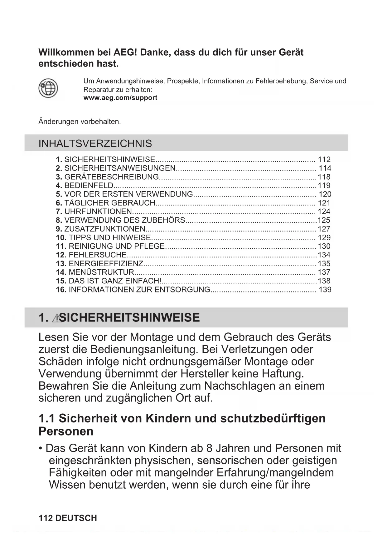 Ihre Pflichten als Endnutzer Dieses Elektro- bzw. Elektronikgerät ist mit einer durchgestrichenen Abfalltonne auf Rädern gekennzeichnet. Das Gerät darf deshalb nur getrennt vom unsortierten Siedlungsabfall gesammelt und zurückgenommen werden, es darf also nicht in den Hausmüll gegeben werden. Das Gerät kann z. B. bei einer kommunalen Sammelstelle oder ggf. bei einem Vertreiber (siehe zu deren Rücknahmepflichten unten) abgegeben werden. Das gilt auch für alle Bauteile, Unterbaugruppen und Verbrauchsmaterialien des zu entsorgenden Altgeräts. Bevor das Altgerät entsorgt werden darf, müssen alle Altbatterien und Altakkumulatoren vom Altgerät getrennt werden, die nicht vom Altgerät umschlossen sind. Das gleiche gilt für Lampen, die zerstörungsfrei aus dem Altgerät entnommen werden können. Der Endnutzer ist zudem selbst dafür verantwortlich, personenbezogene Daten auf dem Altgerät zu löschen. Hinweise zum Recycling Helfen Sie mit, alle Materialien zu recyceln, die mit diesem Symbol gekennzeichnet sind. Entsorgen Sie solche Materialien, insbesondere Verpackungen, nicht im Hausmüll sondern über die bereitgestellten Recyclingbehälter oder die entsprechenden örtlichen Sammelsysteme. Recyceln Sie zum Umwelt- und Gesundheitsschutz auch elektrische und elektronische Geräte. DEUTSCH 139Rücknahmepflichten der Vertreiber in Deutschland Wer auf mindestens 400 m² Verkaufsfläche Elektro- und Elektronikgeräte vertreibt oder sonst geschäftlich an Endnutzer abgibt, ist verpflichtet, bei Abgabe eines neuen Geräts ein Altgerät des Endnutzers der gleichen Geräteart, das im Wesentlichen die gleichen Funktionen wie das neue Gerät erfüllt, am Ort der Abgabe oder in unmittelbarer Nähe hierzu unentgeltlich zurückzunehmen. Das gilt auch für Vertreiber von Lebensmitteln mit einer Gesamtverkaufsfläche von mindestens 800 m², die mehrmals im Kalenderjahr oder dauerhaft Elektro- und Elektronikgeräte anbieten und auf dem Markt bereitstellen. Solche Vertreiber müssen zudem auf Verlangen des Endnutzers Altgeräte, die in keiner äußeren Abmessung größer als 25 cm sind (kleine Elektrogeräte), im Einzelhandelsgeschäft oder in unmittelbarer Nähe hierzu unentgeltlich zurückzunehmen; die Rücknahme darf in diesem Fall nicht an den Kauf eines Elektro- oder Elektronikgerätes geknüpft, kann aber auf drei Altgeräte pro Geräteart beschränkt werden. Ort der Abgabe ist auch der private Haushalt, wenn das neue Elektro- oder Elektronikgerät dorthin geliefert wird; in diesem Fall ist die Abholung des Altgerätes für den Endnutzer kostenlos. Die vorstehenden Pflichten gelten auch für den Vertrieb unter Verwendung von Fernkommunikationsmitteln, wenn die Vertreiber Lager- und Versandflächen für Elektro- und Elektronikgeräte bzw. Gesamtlager- und -versandflächen für Lebensmittel vorhalten, die den oben genannten Verkaufsflächen entsprechen. Die unentgeltliche Abholung von Elektro- und Elektronikgeräten ist dann aber auf Wärmeüberträger (z. B. Kühlschrank), Bildschirme, Monitore und Geräte, die Bildschirme mit einer Oberfläche von mehr als 100 cm² enthalten, und Geräte beschränkt, bei denen mindestens eine der äußeren Abmessungen mehr als 50 cm beträgt. Für alle übrigen Elektro- und Elektronikgeräte muss der Vertreiber geeignete Rückgabemöglichkeiten in zumutbarer Entfernung zum jeweiligen Endnutzer gewährleisten; das gilt auch für kleine Elektrogeräte (s.o.), die der Endnutzer zurückgeben will, ohne ein neues Gerät zu kaufen. Rücknahmepflichten von Vertreibern und andere Möglichkeiten der Entsorgung von Elektro- und Elektronikgeräten in der Region Wallonien Vertreiber, die Elektro- und Elektronikgeräte verkaufen, sind verpflichtet, bei der Lieferung von Neugeräten Altgeräte desselben Typs, die im Wesentlichen die gleichen Funktionen wie die Neugeräte erfüllen, kostenlos vom Endverbraucher zurückzunehmen. Dies gilt auch bei der Lieferung von neuen Elektro- und Elektronikgeräten oder beim Fernabsatz. Darüber hinaus ist jeder, der Elektro- und Elektronikgeräte auf einer Verkaufsfläche von mindestens 400 m² verkauft, verpflichtet, Altgeräte, die in keiner äußeren Abmessung größer als 25 cm sind (Elektrokleingeräte), im Ladengeschäft oder in unmittelbarer Nähe kostenlos zurückzunehmen; die Rücknahme darf in diesem Fall nicht vom Kauf eines Elektro- oder Elektronikgerätes abhängig gemacht werden. Die Rücknahme von Elektro- und Elektronikgeräten kann auch auf Containerplätzen oder zugelassenen Recyclinghöfen erfolgen. Für weitere Informationen wenden Sie sich bitte an Ihre Gemeindeverwaltung. 140 DEUTSCHBem-vindo(a) à AEG! Obrigado por escolher o nosso aparelho. Obter conselhos de utilização, folhetos, resolução de problemas e informações sobreassistência e reparações:www.aeg.com/supportSujeito a alterações sem aviso prévio. ÍNDICE 1. INFORMAÇÕES DE SEGURANÇA............................................................1412. INSTRUÇÕES DE SEGURANÇA............................................................... 143