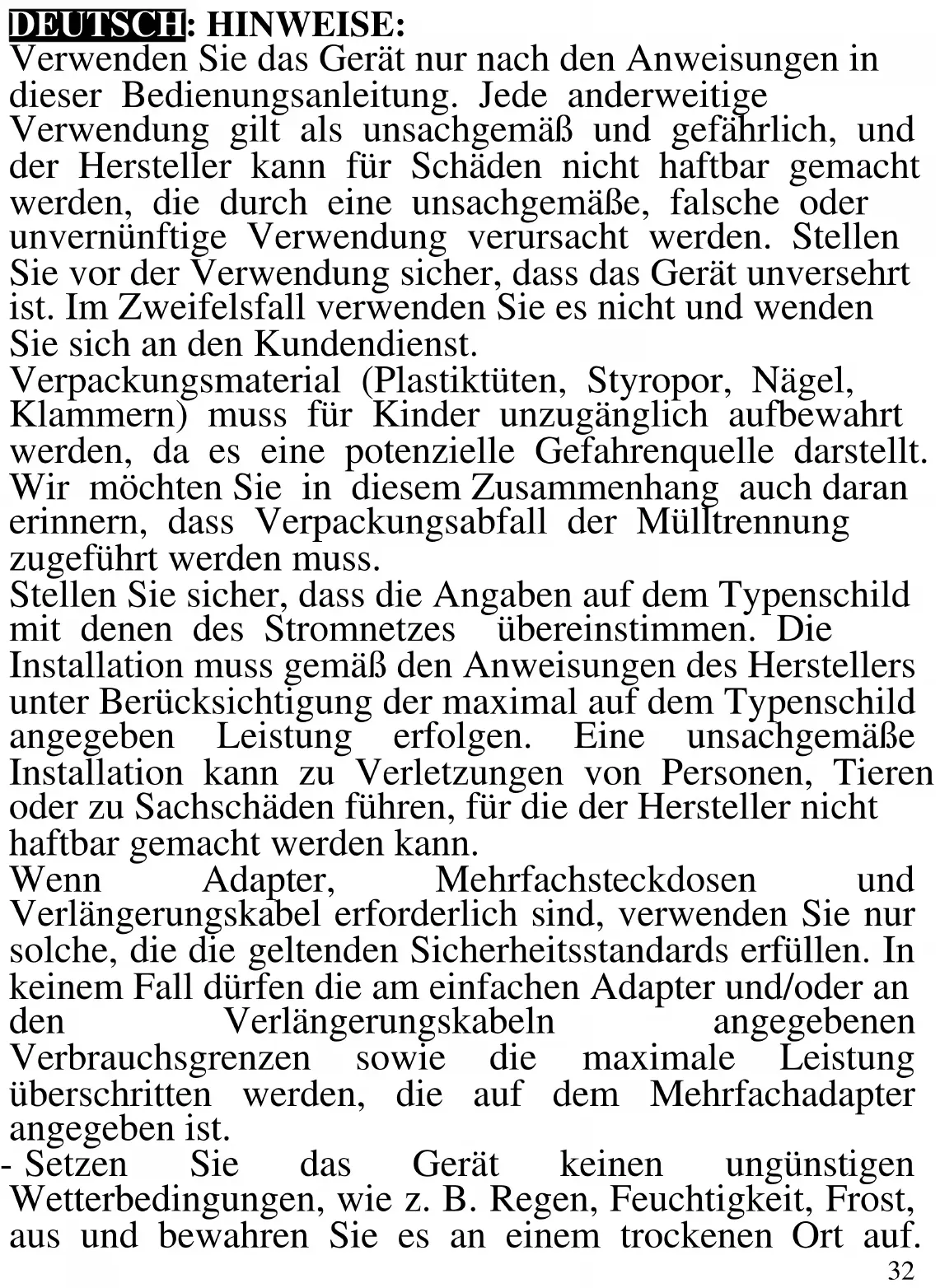 - Accesorios: anillo giratorio, plato de vidrio, rejilla elevada32 DEUTSCH: HINWEISE: Verwenden Sie das Gerät nur nach den Anweisungen in dieser Bedienungsanleitung. Jede anderweitige Verwendung gilt als unsachgemäß und gefährlich, und der Hersteller kann für Schäden nicht haftbar gemacht werden, die durch eine unsachgemäße, falsche oder unvernünftige Verwendung verursacht werden. Stellen Sie vor der Verwendung sicher, dass das Gerät unversehrt ist. Im Zweifelsfall verwenden Sie es nicht und wenden Sie sich an den Kundendienst. Verpackungsmaterial (Plastiktüten, Styropor, Nägel, Klammern) muss für Kinder unzugänglich aufbewahrt werden, da es eine potenzielle Gefahrenquelle darstellt. Wir möchten Sie in diesem Zusammenhang auch daran erinnern, dass Verpackungsabfall der Mülltrennung zugeführt werden muss. Stellen Sie sicher, dass die Angaben auf dem Typenschild mit denen des Stromnetzes übereinstimmen. Die Installation muss gemäß den Anweisungen des Herstellers unter Berücksichtigung der maximal auf dem Typenschild angegeben Leistung erfolgen. Eine unsachgemäße Installation kann zu Verletzungen von Personen, Tieren oder zu Sachschäden führen, für die der Hersteller nicht haftbar gemacht werden kann. Wenn Adapter, Mehrfachsteckdosen und Verlängerungskabel erforderlich sind, verwenden Sie nur solche, die die geltenden Sicherheitsstandards erfüllen. In keinem Fall dürfen die am einfachen Adapter und/oder an den Verlängerungskabeln angegebenen Verbrauchsgrenzen sowie die maximale Leistung überschritten werden, die auf dem Mehrfachadapter angegeben ist. - Setzen Sie das Gerät keinen ungünstigen Wetterbedingungen, wie z. B. Regen, Feuchtigkeit, Frost, aus und bewahren Sie es an einem trockenen Ort auf.33 Fassen Sie das Gerät nicht mit nassen Händen an und verwenden Sie es nicht barfuß. - Verwenden Sie das Netzkabel nicht in der Nähe von scharfen Gegenständen oder heißen Oberflächen und ziehen Sie den Netzstecker nicht am Netzkabel aus der Steckdose. Lassen Sie es nicht von der Arbeitsplatte baumeln, wo ein Kind es halten könnte. Verwenden Sie das Gerät im Falle von Schäden am Netzkabel, Stecker oder im Falle von Kurzschlüssen nicht und lassen Sie es in einer Vertragswerkstatt reparieren. - Dieses Gerät kann von Kindern ab 8 Jahren und von Personen mit eingeschränkten körperlichen, sensorischen oder geistigen Fähigkeiten oder mangelnder Erfahrung und Kenntnissen verwendet werden, wenn sie beaufsichtigt oder instruiert wurden, um das Gerät sicher zu verwenden und die damit verbundenen Gefahren zu verstehen. Kinder dürfen nicht mit dem Gerät spielen. Reinigung und Benutzerwartung dürfen nicht von Kindern ohne Aufsicht durchgeführt werden. - Kinder dürfen nicht mit dem Gerät spielen. - Bewahren Sie das Gerät und sein Netzanschluss außerhalb der Reichweite von Kinder unter 8 Jahren. - Nicht für den gewerblichen Gebrauch bestimmt. Nur für den Hausgebrauch bestimmt. WARNUNG: Dieses Gerät enthält eine Heizfunktion. Oberflächen, außer die funktionellen Oberflächen können hohe Temperaturen entwickeln. Da die Temperaturen von verschiedene Personen unterschiedlich wahrgenommen werden, sollte dieses Gerät mit VORSICHT verwendet werden. Halten Sie das Gerät ausschließlich auf Griffflächen die abhalten und verwenden Sie solche Hitzeschutzmaßen wie Hitzeschutzhandschuhe oder Topflappen. Im Falle eines Defekts und/oder von Fehlfunktionen das Gerät nicht öffnen. Für Reparaturen wenden Sie sich an34 eine vom Hersteller autorisierte Werkstatt (Vertragswerkstatt) und fordern Sie den Einsatz von Original-Ersatzteilen. Die Nichtbeachtung der obigen Vorschriften kann die Sicherheit beeinträchtigen und zur Folge haben, dass die Garantie erlischt. Dieses Gerät ist nur für den Hausgebrauch oder gleichwertiges bestimmt, in Situationen wie bspw.: Kantinen in kleinen Firmen oder ähnliche Arbeitsumgebungen, von Kunden in Hotels, Motels oder andere Art von touristische Unterkunft, wie ländlicher oder Wohn –Tourismus. Das Gerät darf nicht mit einer Zeitschaltuhr oder mit einem separaten Fernwirksystem betrieben werden Führen Sie vor jedem Gebrauch das Netzkabel aus. Setzen Sie das Produkt keinen Stößen aus, es könnte beschädigt werden. Verwenden Sie nur originale und kompatible Teile und Zubehör. Halten Sie das Gerät fern von brennbaren Materialien, Wärmequellen, Dampf-und kalte Zonen. GEBRAUCHSANWEISUNGEN Das Gerät niemals ohne Inhalt oder ohne den Glassteller in Betrieb nehmen; Es könnte beschädigt werden. Wenn Sie den Mikrowellenherd verwenden, benutzen Sie nur Behälter und Nahrung die mit dieser Art von Kochen kompatibel sind. Benutzen Sie den Ofen nicht, wenn Sie Schäden an der Tür oder in der Türdichtung bemerken. Jedes Mal, wenn Rauch oder ein Brandgeruch aus dem Ofen auftretet, das Kochen sofort stoppen, ziehen Sie den Stecker heraus und die Tür geschlossen halten, um eventuellen Flammen zu ersticken. Nachdem Sie Nahrung für Kinder gekocht oder aufgewärmt haben, rühren um die Temperatur zu uniformieren.35 Kein aufgewärmtes oder gekochtes Essen schlucken, bevor 3 Minuten nach herausnehmen abgelaufen sind. Behandeln Sie die zubereiteten Speisen mit Vorsicht, weil die verbrennen können. Tauchen Sie den Ofen nie ins Wasser oder andere Flüssigkeiten und Vermeiden Sie, dass es von Wasserspritze erreicht wird. Um die Exposition von Mikrowellengefahr zu vermeiden, nicht missbrauchen und entfernen Sie keinen Komponenten, solche Eingriffe dürfen nur von qualifiziertes Personal durchgeführt werden. Benutzen Sie das Gerät nicht, während noch verpackt. Eine Sicherheitseinrichtung hört die Wellenemission auf, wenn sich die Tür öffnet. Dieselbe ermöglicht kein kochen, solange die Tür geöffnet ist. INSTALLATION - Alle Materialen vom Kochraum entfernen. - Der Ofen ist ziemlich schwer; er soll auf eine solide und stabile Oberfläche gestellt werden. Während des Gebrauchs ein ausreichendes Abstand auf beide Seiten des Geräte