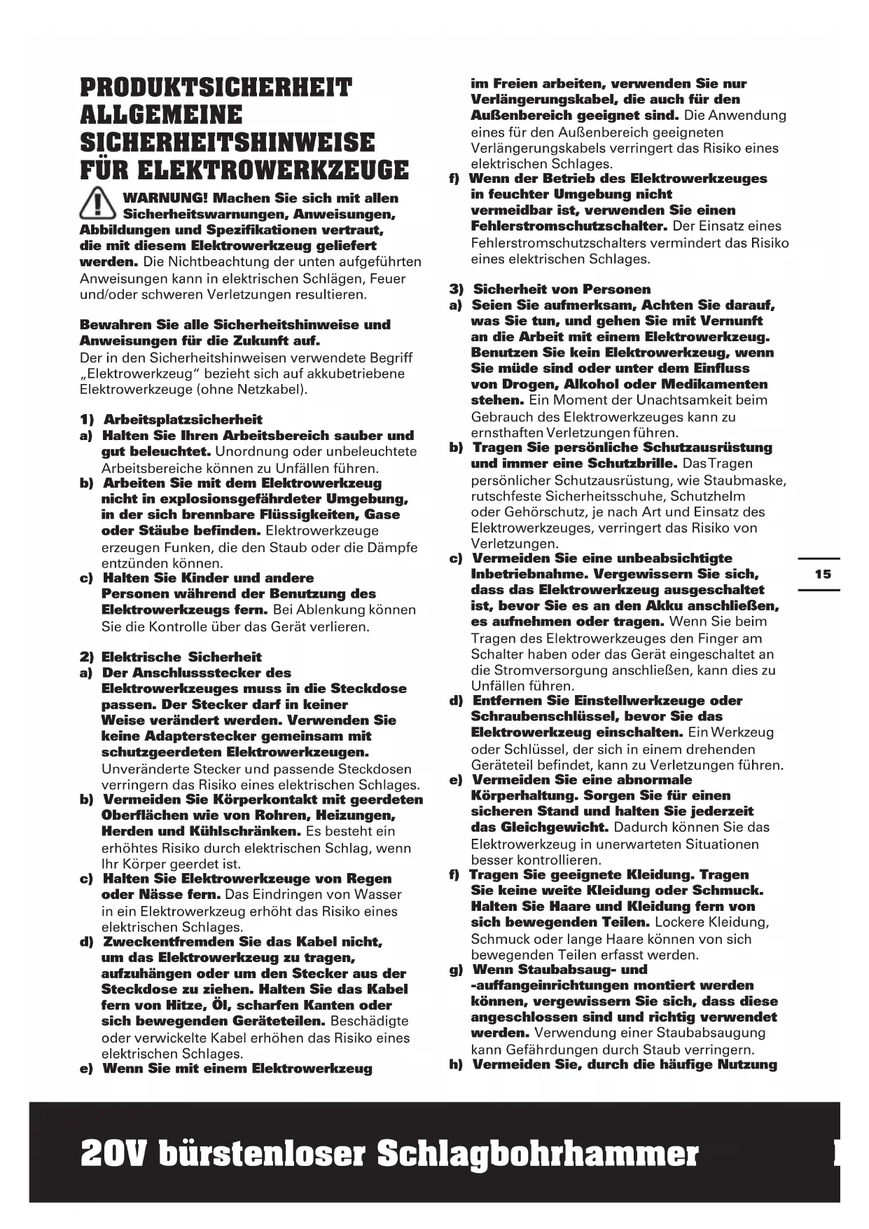 HINWEIS: Lesen Sie das Handbuch vor Inbetriebnahme des Werkzeuges sorgfältig durch. Bestimmungsgemäßer Gebrauch Das Elektrowerkzeug ist bestimmt zum Hammerbohren in Beton, Ziegel und Gestein. Es ist ebenso geeignet zum Bohren in Holz, Metall, Keramik und Kunststoff.