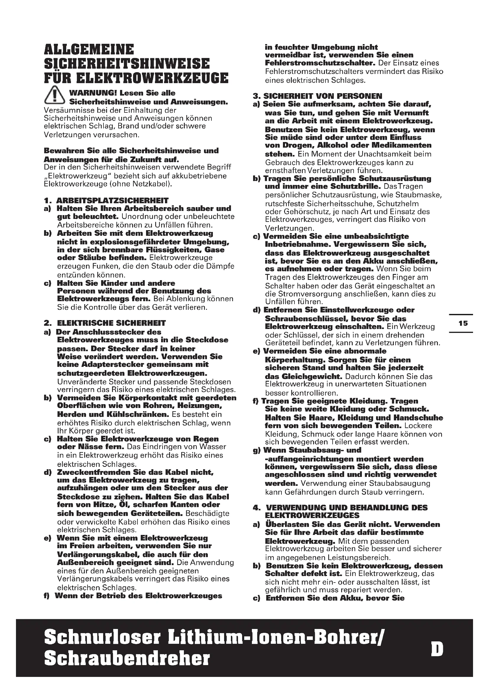WARNUNG! Lesen Sie alle Sicherheitshinweise und Anweisungen. Versäumnisse bei der Einhaltung der Sicherheitshinweise und Anweisungen können elektrischen Schlag, Brand und/oder schwere Verletzungen verursachen. Bewahren Sie alle Sicherheitshinweise und Anweisungen für die Zukunft auf. Der in den Sicherheitshinweisen verwendete Begriff „Elektrowerkzeug“ bezieht sich auf akkubetriebene Elektrowerkzeuge (ohne Netzkabel).
