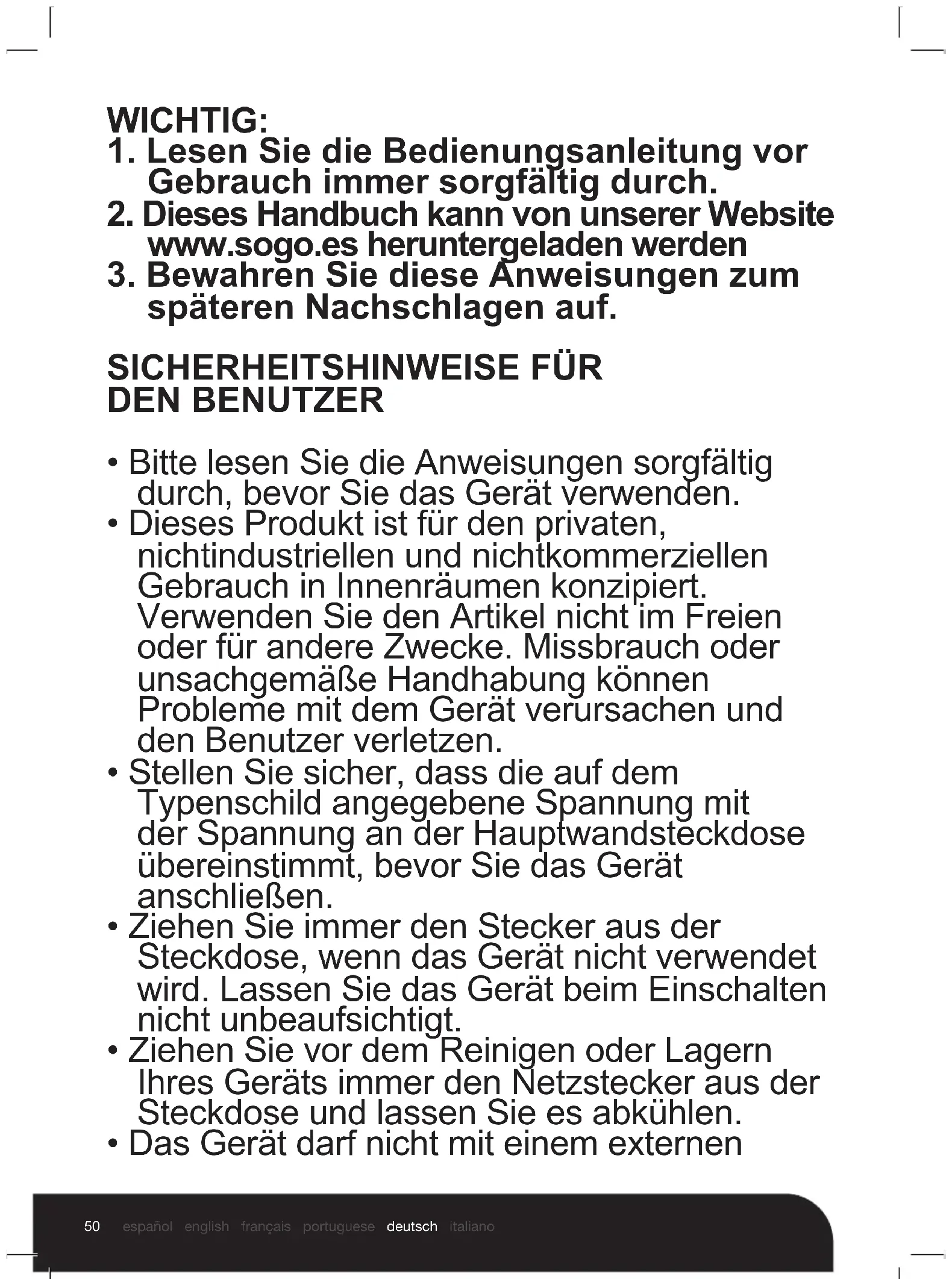 - Das Gerät darf nicht mit einem externen51 español english français portuguese deutsch italiano Timer oder einer separaten Fernbedienung betrieben werden.