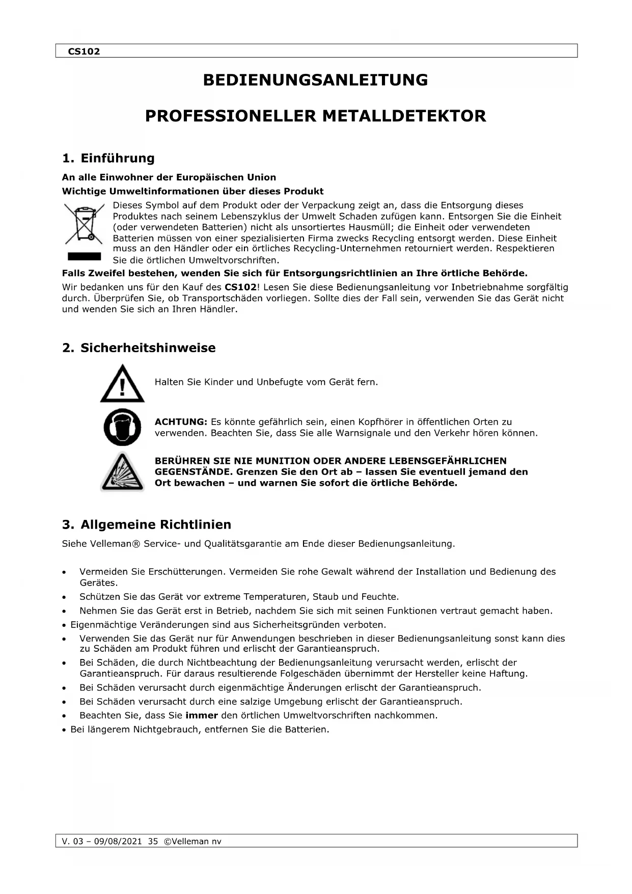 Differenzierung .............. Notch (Ausblenden von nicht gewünschten Gegenständen), Tonsignal Frequenz ............................................................................................................. 5.7 kHz Empfindlichkeit ..................................................... 20 cm für eine Münze von € 2 (Ø 25 mm), ......................................................... im 'All metal'-Modus und unter idealen Umständen Lo-Bat-Anzeige ................................................................................ rote LED wenn < 8.8 V Signalausgang ......................................... Lautsprecher oder 3.5 mm-Anschluss für Kopfhörer Display ....................................................................................... 2.5" analoges Panelmeter Stromversorgung .................................................... 8 x 1.5 V AA-Batterie (nicht mitgeliefert) Abmessungen Länge ..................................................................................... 112 - 144 cm (44" - 57") Suchspule ............................................................................................. Ø 22 cm (8.6") Gewicht .................................................................................................. 1260 g (2.78 lb.) Verwenden Sie dieses Gerät nur mit originellen Zubehörteilen. Velleman NV übernimmt keine Haftung für Schaden oder Verletzungen bei (falscher) Anwendung dieses Gerätes. Für mehr Informationen zu diesem Produkt und die neueste Version dieser Bedienungsanleitung, siehe www.velleman.eu. Alle Änderungen ohne vorherige Ankündigung vorbehalten. RED Konformitätserklärung Hiermit erklärt Velleman NV, dass der Funkanlagentyp [CS102] der Richtlinie 2014/53/EU entspricht. Der vollständige Text der EU-Konformitätserklärung ist unter der folgenden Internetadresse verfügbar: www.velleman.eu. © URHEBERRECHT Velleman NV besitzt das Urheberrecht für diese Bedienungsanleitung. Alle weltweiten Rechte vorbehalten. Ohne vorherige schriftliche Genehmigung des Urhebers ist es nicht gestattet, diese Bedienungsanleitung ganz oder in Teilen zu reproduzieren, zu kopieren, zu übersetzen, zu bearbeiten oder zu speichern.CS102