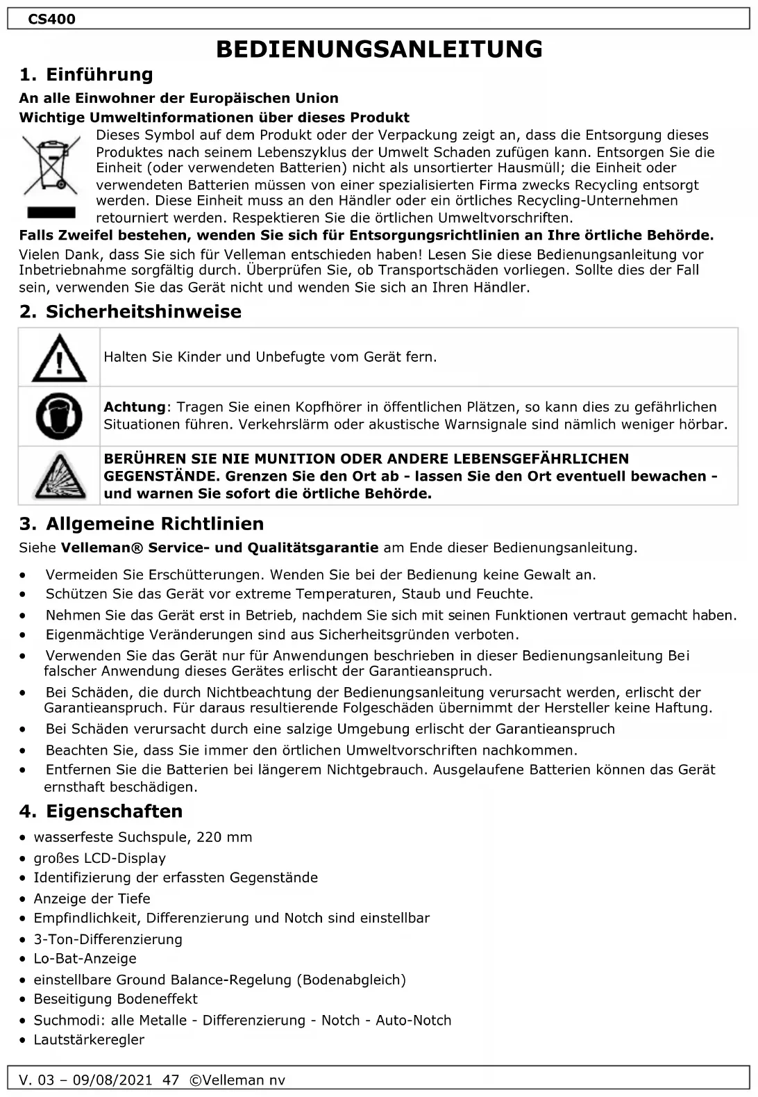 Laden Sie die Anleitung für Ihr Detektor kostenlos im PDF-Format! Finden Sie Ihr Handbuch CS400 - VELLEMAN und nehmen Sie Ihr elektronisches Gerät wieder in die Hand. Auf dieser Seite sind alle Dokumente veröffentlicht, die für die Verwendung Ihres Geräts notwendig sind. CS400 von der Marke VELLEMAN.