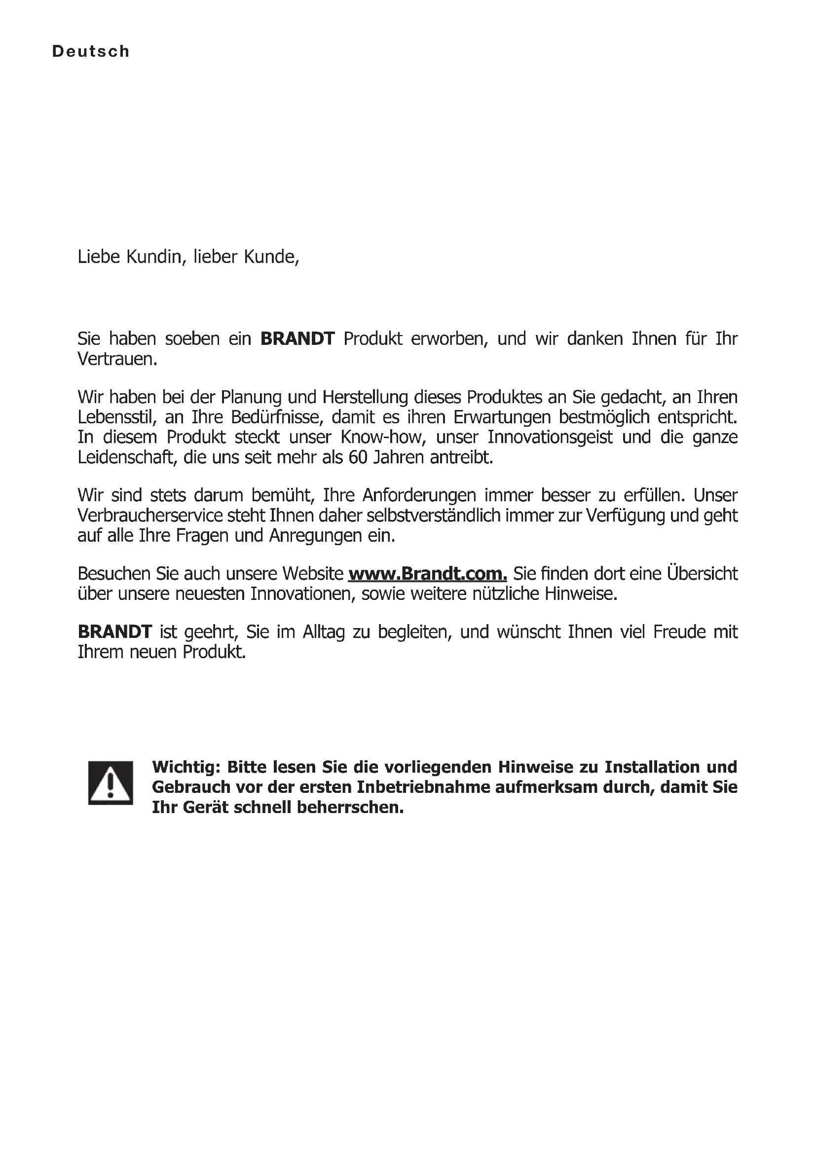 INTERVENCIONES Las eventuales intervenciones que pueda requerir el aparato deberán ser efectuadas un profesional cualicado y autorizado. Para facilitar el tratamiento de su solicitud, cuando llame no olvide dar las referencias completas del aparato (referencia comercial, referencia de servicio y número de serie).Deutsch Liebe Kundin, lieber Kunde, Sie haben soeben ein BRANDT Produkt erworben, und wir danken Ihnen für Ihr Vertrauen. Wir haben bei der Planung und Herstellung dieses Produktes an Sie gedacht, an Ihren Lebensstil, an Ihre Bedürfnisse, damit es ihren Erwartungen bestmöglich entspricht. In diesem Produkt steckt unser Know-how, unser Innovationsgeist und die ganze Leidenschaft, die uns seit mehr als 60 Jahren antreibt. Wir sind stets darum bemüht, Ihre Anforderungen immer besser zu erfüllen. Unser Verbraucherservice steht Ihnen daher selbstverständlich immer zur Verfügung und geht auf alle Ihre Fragen und Anregungen ein. Besuchen Sie auch unsere Website www.Brandt.com. Sie nden dort eine Übersicht über unsere neuesten Innovationen, sowie weitere nützliche Hinweise. BRANDT ist geehrt, Sie im Alltag zu begleiten, und wünscht Ihnen viel Freude mit Ihrem neuen Produkt. Wichtig: Bitte lesen Sie die vorliegenden Hinweise zu Installation und Gebrauch vor der ersten Inbetriebnahme aufmerksam durch, damit Sie Ihr Gerät schnell beherrschen.Deutsch Dieses Gerät kann von Kindern ab einem Alter von 8 Jahren, von Personen mit körperlich, sensorisch oder geistig eingeschränkten Fähigkeiten oder von Personen ohne Erfahrung oder Kenntnis verwendet werden, wenn sie ordnungsgemäß in die Gerätebenutzung eingewiesen worden sind, auch was die Sicherheit betrifft, und wenn sie die damit verbundenen Risiken verstehen. Kinder dürfen dieses Gerät nicht als Spielzeug nutzen. Reinigung und Pege durch den Benutzer dürfen nicht durch unbewachte Kinder ausgeführt werden. Kinder in einem Alter von weniger als 8 Jahren müssen vom Gerät ferngehalten werden, sofern sie nicht ständig überwacht werden. Das Gerät und seine zugänglichen Teile werden bei der Benutzung heiß. Es müssen Vorkehrungen getroffen werden, um zu vermeiden, dass die Heizelemente berührt werden. Gegenstände aus Metall wie Messer, Gabeln, Löffel und Deckel dürfen nicht auf der Fläche abgestellt werden, weil sie heiß werden könnten. Das Kochfeld verfügt über eine Kindersicherung, die die Benutzung nach Abschaltung oder während des Kochvorgangs sperrt (siehe Kapitel: Nutzung der Kindersicherung). Das Gerät entspricht den einschlägigen europäischen Richtlinien und Vorschriften. Der Herzschrittmacher muss vorschriftsmäßig konzipiert und eingestellt sein, damit Interferenzen zwischen dem Kochfeld und dem Herzschrittmacher verhindert werden. Erkundigen Sie sich beim Hersteller des Herzschrittmachers oder Ihrem behandelnden Arzt. Das unbeaufsichtigte Kochen auf einer Kochplatte mit Fett oder Öl kann gefährlich sein und einen Brand verursachen. Versuchen Sie im Brandfall NIE, das Feuer mit Wasser zu löschen, sondern schalten Sie das Gerät aus und bedecken Sie die Flamme beispielsweise mit einem Deckel oder einer Brandschutzdecke. ACHTUNG: Der Garvorgang muss überwacht werden. Ein kurzer Garvorgang muss ununterbrochen überwacht werden. Brandgefahr: Es dürfen keine