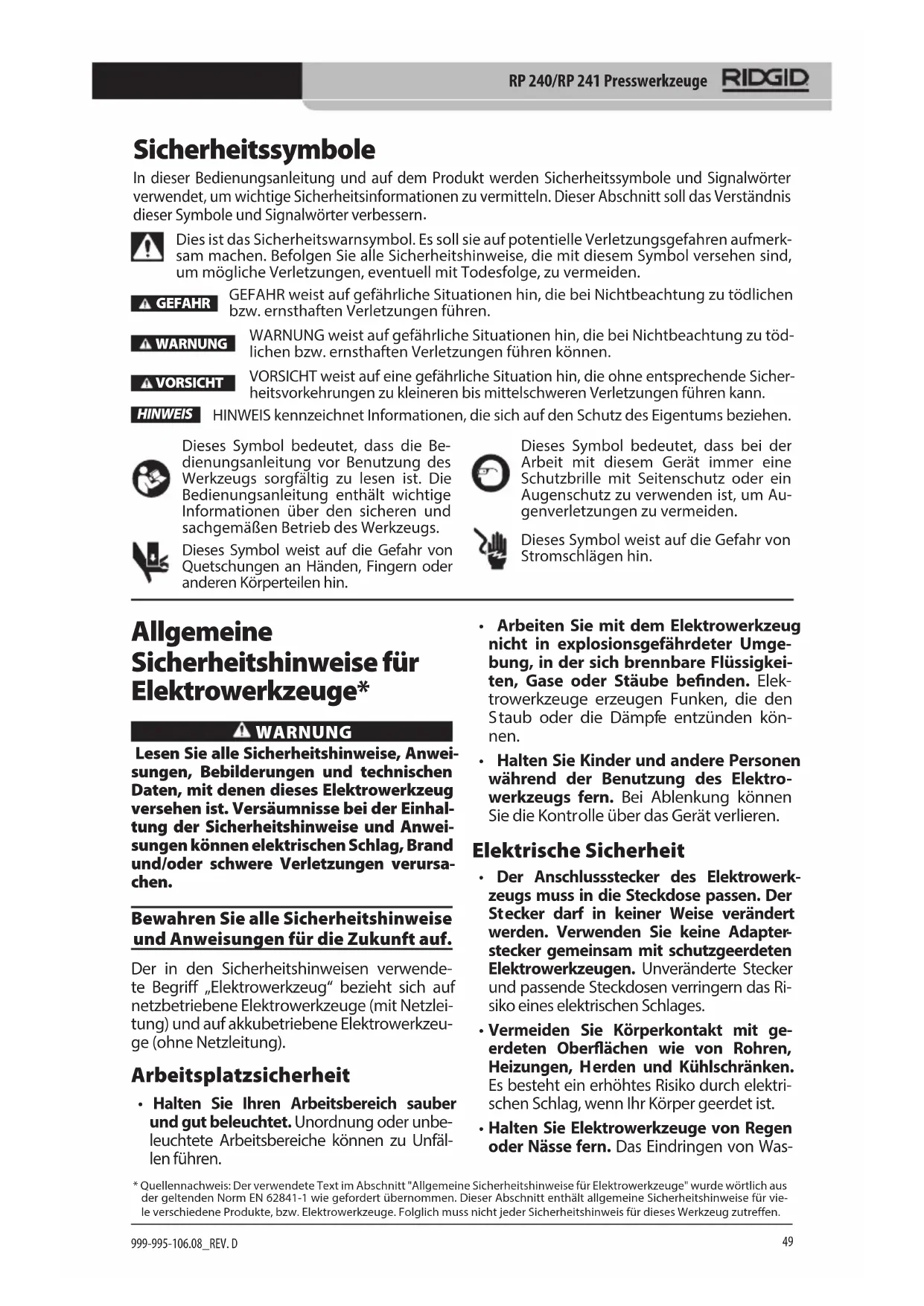 46RP 240/RP 241 Presswerkzeuge RP240/RP 241 WARNUNG! Lesen Sie diese Bedienungsan-leitung vor dem Gebrauch des Werkzeugs sorgfältig durch. Die Unkenntnis und Nichtbeachtung des Inhalts dieser Bedienungs-anleitung kann zu Stromschlag, Brand und/oder schweren Ver-letzungen führen. RP 240/RP 241 Presswerkzeuge Notieren Sie unten die Seriennummer und bewahren Sie diese auf. Sie nden die Produkt-Seriennummer auf dem Typenschild.Serien- Nr.48