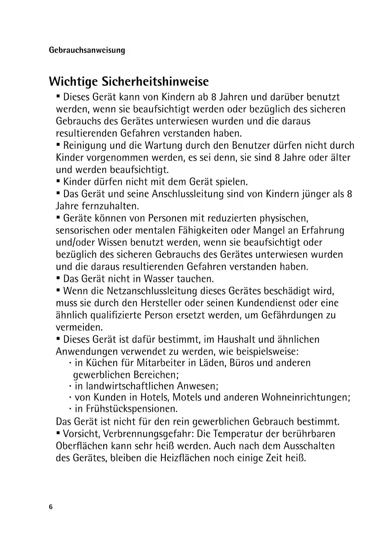 - Reinigung und die Wartung durch den Benutzer dürfen nicht durch Kinder vorgenommen werden, es sei denn, sie sind 8 Jahre oder älter und werden beaufsichtigt.