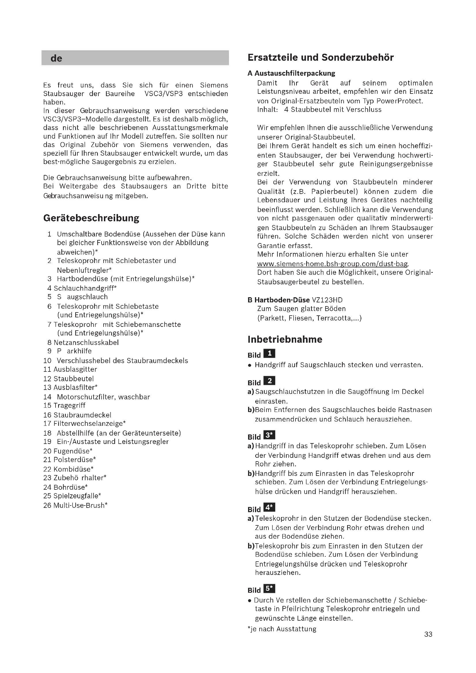 Es freut uns, dass Sie sich für einen Siemens Staubsauger der Baureihe VSC3/VSP3 entschieden haben. In dieser Gebrauchsanweisung werden verschiedene VSC3/VSP3–Modelle dargestellt. Es ist deshalb möglich, dass nicht alle beschriebenen Ausstattungsmerkmale und Funktionen auf Ihr Modell zutr effen. Sie sollten nur das Original Zubehör von Siemens verwenden, das speziell für Ihren Staubsauger entwickelt wurde, um das best-mögliche Saugergebnis zu erzielen. Die Gebrauchsanweisung bitte aufbewahren. Bei Weitergabe des Staubsaugers an Dritte bitte Gebrauchsanweisu ng mitgeben. Gerätebeschreibung 1Umschaltbare Bodendüse (Aussehen der Düse kann bei gleicher Funktionsweise von der Abbildung abweichen)* 2 Teleskoprohr mit Schiebetaster und Nebenluftregler* 3Hartbodendüse (mit Entriegelungshülse)* 4 Schlauchhandgriff* 5Saugschlauch 6 Teleskoprohr mit Schiebetaste (und Entriegelungshülse)* 7 Teleskoprohr mit Schiebemanschette (und Entriegelungshülse)* 8 Netzanschlusskabel 9Parkhilfe 10 Verschlusshebel des Staubraumdeckels 11 Ausblasgitter 12 Staubbeutel 13 Ausblasfilter* 14 Motorschutzfilter, waschbar 15 Tragegriff 16 Staubraumdeckel 17 Filterwechselanzeige* 18 Abstellhilfe (an der Geräteunterseite) 19 Ein-/Austaste und Leistungsregler 20 Fugendüse* 21 Polsterdüse* 22 Kombidüse* 23 Zubehö rhalter* 24 Bohrdüse* 25 Spielzeugfalle* 26 Multi-Use-Brush* Ersatzteile und Sonderzubehör A Austauschfilterpackung Damit Ihr Gerät auf seinem optimalen Leistungsniveau arbeitet, empfehlen wir den Einsatz von Original-Ersatzbeuteln vom Typ PowerProtect. Inhalt: 4 Staubbeutel mit Verschluss Wir empfehlen Ihnen die ausschließliche Verwendung unserer Original-Staubbeutel.