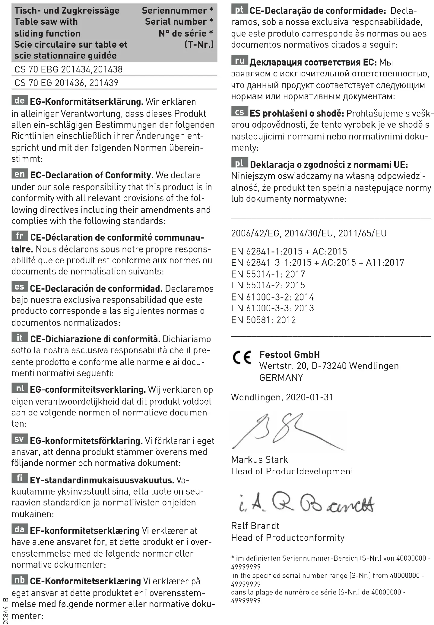 Nur original Festool Ersatzteile verwen- den! Bestell-Nr. unter www.festool.de/service Die Maschine ist mit selbstabschaltenden Spe- zialkohlen ausgerüstet. Sind diese abgenutzt, erfolgt eine automatische Stromunterbrechung und das Gerät kommt zum Stillstand. Warten Sie Ihre Maschine regelmäßig, um deren ordnungsgemäße Funktion sicher zu stellen: - Staubablagerungen durch Absaugen entfer- nen. - Führungsstangen sauber halten und regelmä- ßig fetten. - Zahnräder hinter dem Drehgriff [2-3] sauber halten. - Ein abgenutzter oder beschädigter Tischein- satz [1-7] ist auszutauschen. - Wenn hinabgefallene Holzsplitter den Absaug- kanal der unteren Schutzabdeckung verstop- fen, kann durch Lösen des Drehknopfes [5-8] die Klappe [5-6] einen Spalt von ca. 8 mm ge- öffnet werden, um die Verstopfung zu beseiti- gen. - Bei starken Verstopfungen oder Verklemmen von Sägeanschnitten können die Verschlüs- se [5-7] mit dem Sechskantstiftschlüssel ge- löst werden, so dass die Klappe [5-6] vollstän- dig geöffnet werden kann. Vor Inbetriebnahme ist die Klappe wieder zu schließen. - Wickeln Sie nach Beendigung der Arbeit das Stromkabel [11-1] auf den Zubehörhal- ter [11-4] auf. - Ein Dämpfer bewirkt, dass das Sägeaggregat über die gesamte Zuglänge gleichmäßig zu- rückläuft. Sollte dies nicht der Fall sein, kann der Dämpfer durch die Bohrung [4-5] nachge- stellt werden. Eine Verstärkung der Dämpf- wirkung wird durch Rechtsdrehung der Ein- stellschraube erreicht. Filterreinigung (nur CS 70 EBG) Wenn die Abschaltzyklen der Temperaturüber- wachung (siehe Kap. 7.1) ohne extreme Über- lastung kürzer werden, müssen Sie den Luftan- saugfilter [4-2] reinigen. fLösen Sie den Drehknopf [4-1]. fNehmen Sie den Filtereinsatz heraus. fKlopfen Sie den Staub aus oder saugen Sie die Filteroberfläche ab. fSetzen Sie den Filter wieder ein. L Ersetzen Sie einen beschädigten Filter durch eine neue Filterpatrone. 11 Zubehör, Werkzeuge Festool bietet umfangreiches Zubehör an, das Ihnen einen vielfältigen und effektiven Einsatz Ihrer Maschine gestattet, z.B.: Tischverbreite- rung, Tischverlängerung, Schiebetisch, Kappan- schlag, Absaugset. Um unterschiedliche Materialien schnell und sauber bearbeiten zu können, bietet Festool speziell auf Ihre Maschine abgestimmte Säge- blätter an. Die Bestellnummern für Zubehör und Werkzeuge finden Sie in Ihrem Festool Katalog. 12 Entsorgung Werfen Sie Elektrowerkzeuge nicht in den Haus- müll! Führen Sie die Geräte, Zubehör und Ver- packungen einer umweltgerechten Wiederver- wertung zu. Beachten Sie dabei die geltenden nationalen Vorschriften. Nur EU: Gemäß Europäischer Richtlinie über Elektro- und Elektronik-Altgeräte und Umset- zung in nationales Recht, müssen verbrauchte Elektrowerkzeuge getrennt gesammelt und ei- ner umweltgerechten Wiederverwertung zuge- führt werden. Informationen zur REACh: www.festool.com/reach. P R E C I S I O - D21 P R E C I S I O -