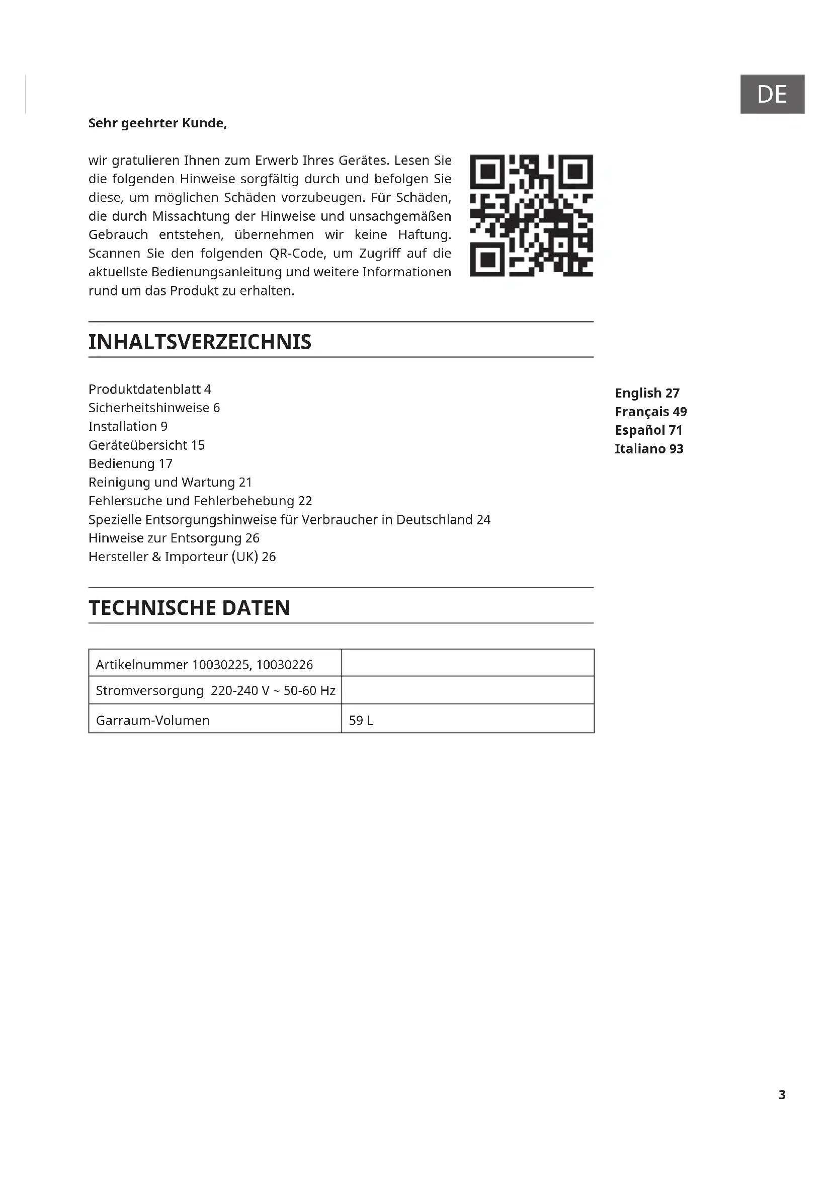 Sehr geehrter Kunde, wir gratulieren Ihnen zum Erwerb Ihres Gerätes. Lesen Sie die folgenden Hinweise sorgfältig durch und befolgen Sie diese, um möglichen Schäden vorzubeugen. Für Schäden, die durch Missachtung der Hinweise und unsachgemäßen Gebrauch entstehen, übernehmen wir keine Haftung. Scannen Sie den folgenden QR-Code, um Zugriff auf die aktuellste Bedienungsanleitung und weitere Informationen rund um das Produkt zu erhalten. INHALTSVERZEICHNIS Produktdatenblatt 4 Sicherheitshinweise 6 Installation 9 Geräteübersicht 15 Bedienung 17 Reinigung und Wartung 21 Fehlersuche und Fehlerbehebung 22 Spezielle Entsorgungshinweise für Verbraucher in Deutschland 24 Hinweise zur Entsorgung 26 Hersteller & Importeur (UK) 26 TECHNISCHE DATEN Artikelnummer 10030225, 10030226 Stromversorgung 220-240 V ~ 50-60 Hz Garraum-Volumen 59 L English 27 Français 49 Español 71 Italiano 934