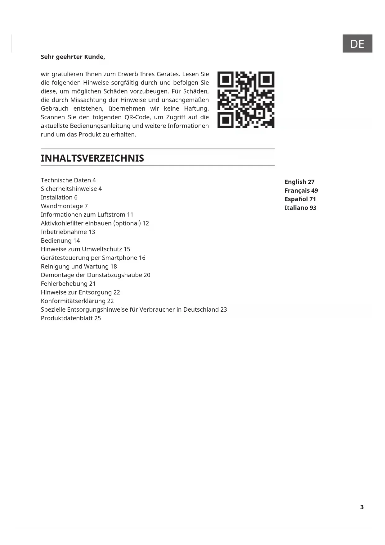 Sehr geehrter Kunde, wir gratulieren Ihnen zum Erwerb Ihres Gerätes. Lesen Sie die folgenden Hinweise sorgfältig durch und befolgen Sie diese, um möglichen Schäden vorzubeugen. Für Schäden, die durch Missachtung der Hinweise und unsachgemäßen Gebrauch entstehen, übernehmen wir keine Haftung. Scannen Sie den folgenden QR-Code, um Zugriff auf die aktuellste Bedienungsanleitung und weitere Informationen rund um das Produkt zu erhalten. INHALTSVERZEICHNIS Technische Daten 4 Sicherheitshinweise 4 Installation 6 Wandmontage 7 Informationen zum Luftstrom 11 Aktivkohlelter einbauen (optional) 12 Inbetriebnahme 13 Bedienung 14 Hinweise zum Umweltschutz 15 Gerätesteuerung per Smartphone 16 Reinigung und Wartung 18 Demontage der Dunstabzugshaube 20 Fehlerbehebung 21 Hinweise zur Entsorgung 22 Konformitätserklärung 22 Spezielle Entsorgungshinweise für Verbraucher in Deutschland 23 Produktdatenblatt 25 English 27 Français 49 Español 71 Italiano 93 Nederlands4