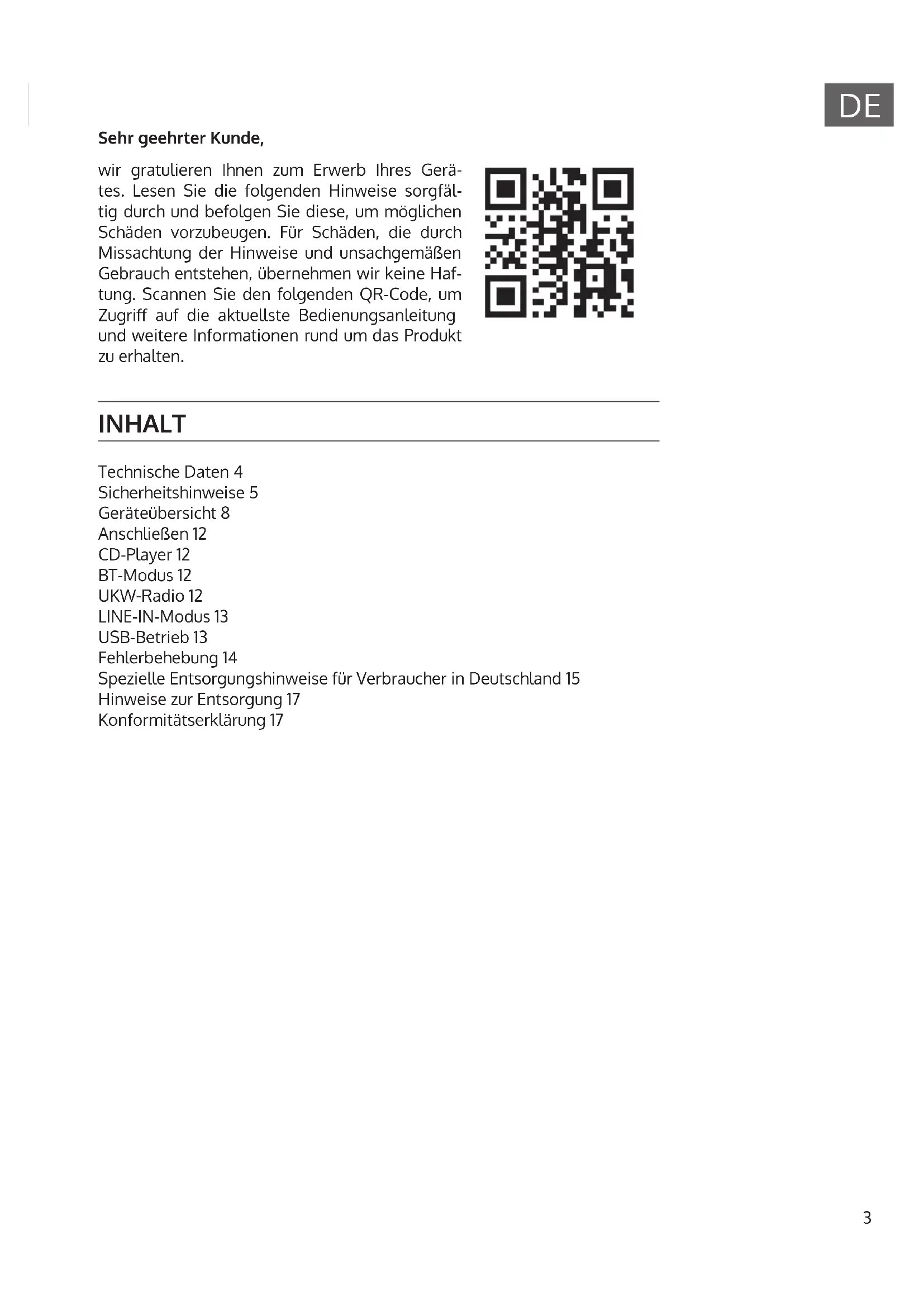 INHALT Technische Daten 4 Sicherheitshinweise 5 Geräteübersicht 8 Anschließen 12 CD-Player 12 BT-Modus 12 UKW-Radio 12 LINE-IN-Modus 13 USB-Betrieb 13 Fehlerbehebung 14 Spezielle Entsorgungshinweise für Verbraucher in Deutschland 15 Hinweise zur Entsorgung 17 Konformitätserklärung 17 Sehr geehrter Kunde, wir gratulieren Ihnen zum Erwerb Ihres Gerä- tes. Lesen Sie die folgenden Hinweise sorgfäl- tig durch und befolgen Sie diese, um möglichen Schäden vorzubeugen. Für Schäden, die durch Missachtung der Hinweise und unsachgemäßen Gebrauch entstehen, übernehmen wir keine Haf- tung. Scannen Sie den folgenden QR-Code, um Zugri auf die aktuellste Bedienungsanleitung und weitere Informationen rund um das Produkt zu erhalten.4