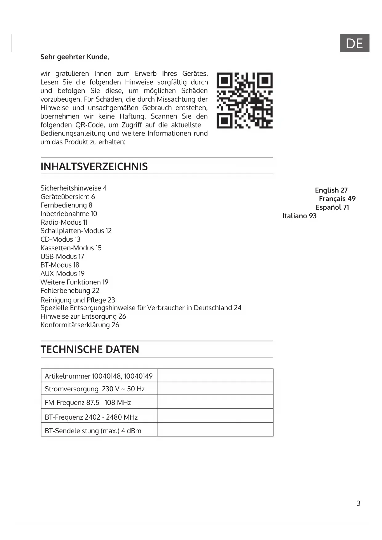 Sehr geehrter Kunde, wir gratulieren Ihnen zum Erwerb Ihres Gerätes. Lesen Sie die folgenden Hinweise sorgfältig durch und befolgen Sie diese, um möglichen Schäden vorzubeugen. Für Schäden, die durch Missachtung der Hinweise und unsachgemäßen Gebrauch entstehen, übernehmen wir keine Haftung. Scannen Sie den folgenden QR-Code, um Zugri auf die aktuellste Bedienungsanleitung und weitere Informationen rund um das Produkt zu erhalten: INHALTSVERZEICHNIS Sicherheitshinweise 4 Geräteübersicht 6 Fernbedienung 8 Inbetriebnahme 10 Radio-Modus 11 Schallplatten-Modus 12 CD-Modus 13 Kassetten-Modus 15 USB-Modus 17 BT-Modus 18 AUX-Modus 19 Weitere Funktionen 19 Fehlerbehebung 22 Reinigung und Pege 23 Spezielle Entsorgungshinweise für Verbraucher in Deutschland 24 Hinweise zur Entsorgung 26 Konformitätserklärung 26 TECHNISCHE DATEN Artikelnummer 10040148, 10040149 Stromversorgung 230 V ~ 50 Hz FM-Frequenz 87.5 - 108 MHz BT-Frequenz 2402 - 2480 MHz BT-Sendeleistung (max.) 4 dBm English 27English 27 Français 49Français 49 Español 71Español 71 Italiano 93 Italiano4