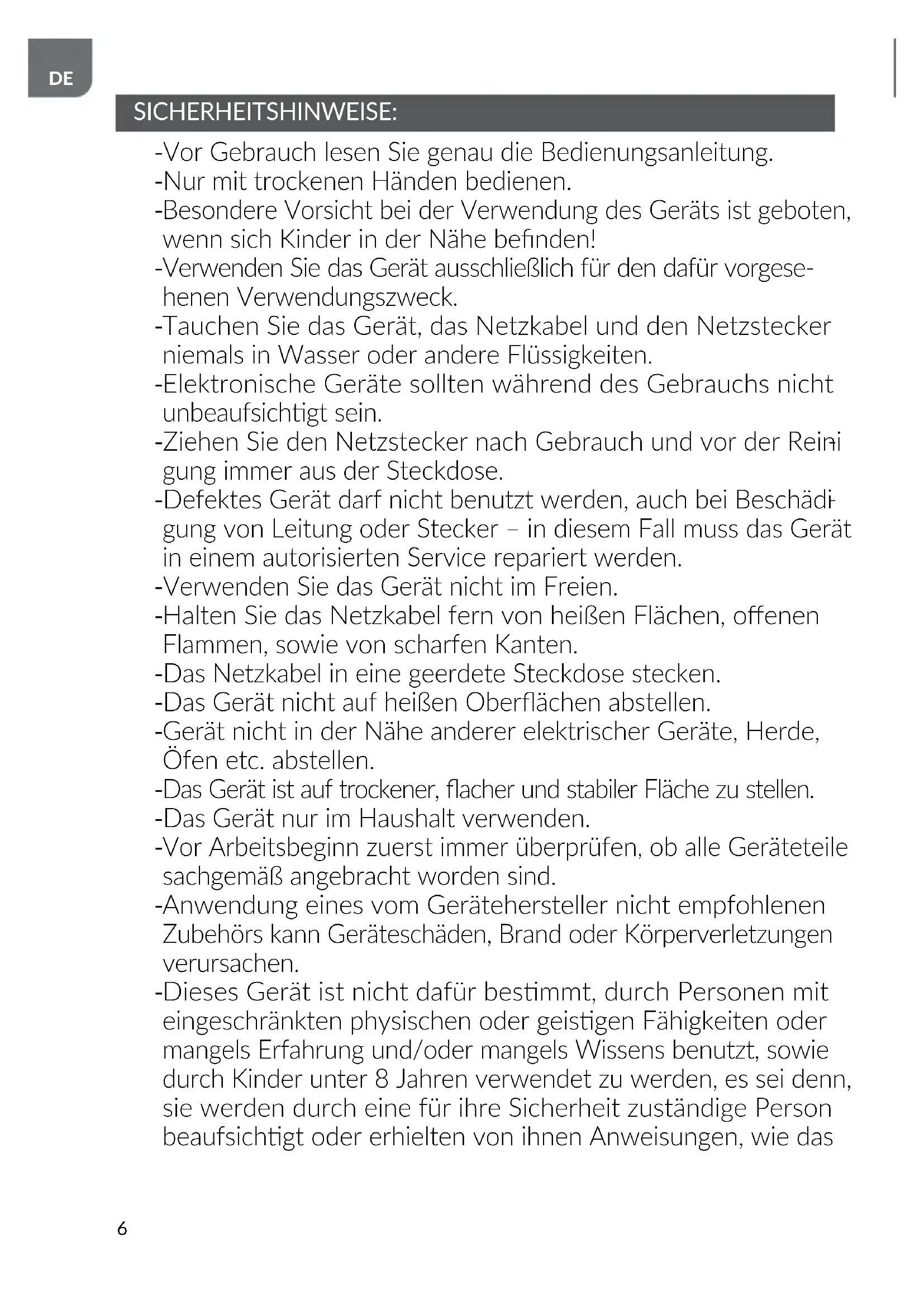 SICHERHEITSHINWEISE: - Vor Gebrauch lesen Sie genau die Bedienungsanleitung. - Nur mit trockenen Händen bedienen.