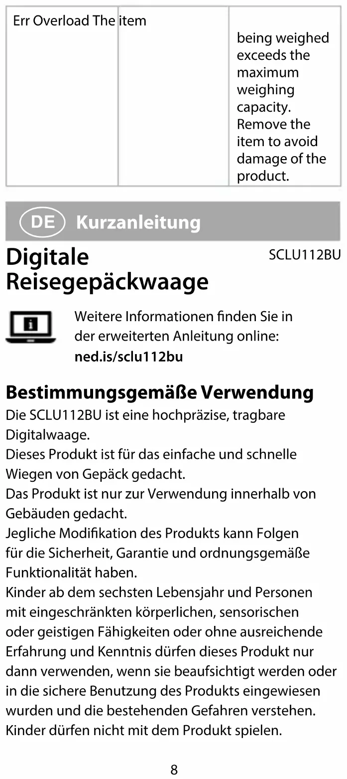 Kurzanleitung Digitale Reisegepäckwaage SCLU112BU Weitere Informationen nden Sie in der erweiterten Anleitung online: ned.is/sclu112bu Bestimmungsgemäße Verwendung Die SCLU112BU ist eine hochpräzise, tragbare Digitalwaage. Dieses Produkt ist für das einfache und schnelle Wiegen von Gepäck gedacht. Das Produkt ist nur zur Verwendung innerhalb von Gebäuden gedacht. Jegliche Modikation des Produkts kann Folgen für die Sicherheit, Garantie und ordnungsgemäße Funktionalität haben. Kinder ab dem sechsten Lebensjahr und Personen mit eingeschränkten körperlichen, sensorischen oder geistigen Fähigkeiten oder ohne ausreichende Erfahrung und Kenntnis dürfen dieses Produkt nur dann verwenden, wenn sie beaufsichtigt werden oder in die sichere Benutzung des Produkts eingewiesen wurden und die bestehenden Gefahren verstehen. Kinder dürfen nicht mit dem Produkt spielen.9 Reinigung und Wartung durch den Benutzer dürfen nicht von unbeaufsichtigten Kindern durchgeführt werden. Hauptbestandteile (Abbildung A) 1 Anzeige 2 Dreiecksring 3 Ein/Aus- und Z/T- Taste 4 Maßeinheitstaste 5 Gurt 6 Haken 7 Batterie 8 Batteriefach 9 Batterieabdeckung Sicherheitshinweise