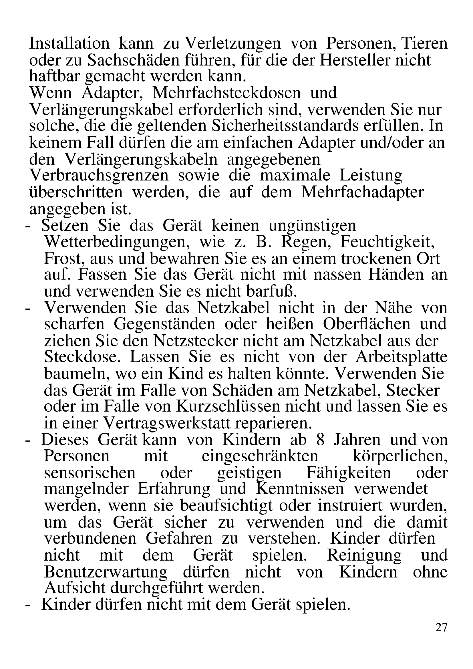 DEUTSCH: HINWEISE: Verwenden Sie das Gerät nur nach den Anweisungen in dieser Bedienungsanleitung. Jede anderweitige Verwendung gilt als unsachgemäß und gefährlich, und der Hersteller kann für Schäden nicht haftbar gemacht werden, die durch eine unsachgemäße, falsche oder unvernünftige Verwendung verursacht werden. Stellen Sie vor der Verwendung sicher, dass das Gerät unversehrt ist. Im Zweifelsfall verwenden Sie es nicht und wenden Sie sich an den Kundendienst. Verpackungsmaterial (Plastiktüten, Styropor, Nägel, Klammern) muss für Kinder unzugänglich aufbewahrt werden, da es eine potenzielle Gefahrenquelle darstellt. Wir möchten Sie in diesem Zusammenhang auch daran erinnern, dass Verpackungsabfall der Mülltrennung zugeführt werden muss. Stellen Sie sicher, dass die Angaben auf dem Typenschild mit denen des Stromnetzes übereinstimmen. Die Installation muss gemäß den Anweisungen des Herstellers unter Berücksichtigung der maximal auf dem Typenschild angegeben Leistung erfolgen. Eine unsachgemäße27 Installation kann zu Verletzungen von Personen, Tieren oder zu Sachschäden führen, für die der Hersteller nicht haftbar gemacht werden kann. Wenn Adapter, Mehrfachsteckdosen und Verlängerungskabel erforderlich sind, verwenden Sie nur solche, die die geltenden Sicherheitsstandards erfüllen. In keinem Fall dürfen die am einfachen Adapter und/oder an den Verlängerungskabeln angegebenen Verbrauchsgrenzen sowie die maximale Leistung überschritten werden, die auf dem Mehrfachadapter angegeben ist. - Setzen Sie das Gerät keinen ungünstigen Wetterbedingungen, wie z. B. Regen, Feuchtigkeit, Frost, aus und bewahren Sie es an einem trockenen Ort auf. Fassen Sie das Gerät nicht mit nassen Händen an und verwenden Sie es nicht barfuß. - Verwenden Sie das Netzkabel nicht in der Nähe von scharfen Gegenständen oder heißen Oberflächen und ziehen Sie den Netzstecker nicht am Netzkabel aus der Steckdose. Lassen Sie es nicht von der Arbeitsplatte baumeln, wo ein Kind es halten könnte. Verwenden Sie das Gerät im Falle von Schäden am Netzkabel, Stecker oder im Falle von Kurzschlüssen nicht und lassen Sie es in einer Vertragswerkstatt reparieren. - Dieses Gerät kann von Kindern ab 8 Jahren und von Personen mit eingeschränkten körperlichen, sensorischen oder geistigen Fähigkeiten oder mangelnder Erfahrung und Kenntnissen verwendet werden, wenn sie beaufsichtigt oder instruiert wurden, um das Gerät sicher zu verwenden und die damit verbundenen Gefahren zu verstehen. Kinder dürfen nicht mit dem Gerät spielen. Reinigung und Benutzerwartung dürfen nicht von Kindern ohne Aufsicht durchgeführt werden. - Kinder dürfen nicht mit dem Gerät spielen.28 - Bewahren Sie das Gerät und sein Netzanschluss außerhalb der Reichweite von Kinder unter 8 Jahren. - Nicht für den gewerblichen Gebrauch bestimmt. Nur für den Hausgebrauch bestimmt. WARNUNG: Dieses Gerät enthält eine Heizfunktion. Oberflächen, außer die funktionellen Oberflächen können hohe Temperaturen entwickeln. Da die Temperaturen von verschiedene Personen unterschiedlich wahrgenommen werden, sollte dieses Gerät mit VORSICHT verwendet werden. Halten Sie das Gerät ausschließlich auf Griffflächen die abhalten und verwenden Sie solche Hitzeschutzmaßen wie Hitzeschutzhandschuhe oder Topflappen. Im Falle eines Defekts und/oder von Fehlfunktionen das Gerät nicht öffnen. Für Reparaturen wenden Sie sich an eine vom Hersteller autorisierte Werkstatt (Vertragswerkstatt) und fordern Sie den Einsatz von Original-Ersatzteilen. Die Nichtbeachtung der obigen Vorschriften kann die Sicherheit beeinträchtigen und zur Folge haben, dass die Garantie erlischt. Dieses Gerät ist nur für den Hausgebrauch oder gleichwertiges bestimmt, in Situationen wie bspw.: Kantinen in kleinen Firmen oder ähnliche Arbeitsumgebungen, von Kunden in Hotels, Motels oder andere Art von touristische Unterkunft, wie ländlicher oder Wohn –Tourismus. Das Gerät darf nicht mit einer Zeitschaltuhr oder mit einem separaten Fernwirksystem betrieben werden Führen Sie vor jedem Gebrauch das Netzkabel aus. Setzen Sie das Produkt keinen Stößen aus, es könnte beschädigt werden. Verwenden Sie nur originale und kompatible Teile und Zubehör. Halten Sie das Gerät fern von brennbaren Materialien, Wärmequellen, Dampf-und kalte Zonen.29 GEBRAUCHSANWEISUNGEN Das Gerät niemals ohne Inhalt oder ohne den Glassteller in Betrieb nehmen; Es könnte beschädigt werden. Wenn Sie den Mikrowellenherd verwenden, benutzen Sie nur Behälter und Nahrung die mit dieser Art von Kochen kompatibel sind. Benutzen Sie den Ofen nicht, wenn Sie Schäden an der Tür oder in der Türdichtung bemerken. Jedes Mal, wenn Rauch oder ein Brandgeruch aus dem Ofen auftretet, das Kochen sofort stoppen, ziehen Sie den Stecker heraus und die Tür geschlossen halten, um eventuellen Flammen zu ersticken. Nachdem Sie Nahrung für Kinder gekocht oder aufgewärmt haben, rühren um die Temperatur zu uniformieren. Kein aufgewärmtes oder gekochtes Essen schlucken, bevor 3 Minuten nach herausnehmen abgelaufen sind. Behandeln Sie die zubereiteten Speisen mit Vorsicht, weil die verbrennen können. Tauchen Sie den Ofen nie ins Wasser oder andere Flüssigkeiten und Vermeiden Sie, dass es von Wasserspritze erreicht wird. Um die Exposition von Mikrowellengefahr zu vermeiden, nicht missbrauchen und entfernen Sie keinen Komponenten, solche Eingriffe dürfen nur von qualifiziertes Personal durchgeführt werden. Benutzen Sie das Gerät nicht, während noch verpackt. Eine Sicherheitseinrichtung hört die Wellenemission auf, wenn sich die Tür öffnet. Dieselbe ermöglicht kein kochen, solange die Tür geöffnet ist. INSTALLATION - Alle Materialen vom Kochraum entfernen. - Der Ofen ist ziemlich schwer; er soll auf eine solide und stabile Oberfläche gestellt werden. Während des Gebrauchs ein ausreichendes Abstand auf beide Seiten des Gerätes lassen. - Verwenden Sie es nicht als Unterstützung und Aufräume