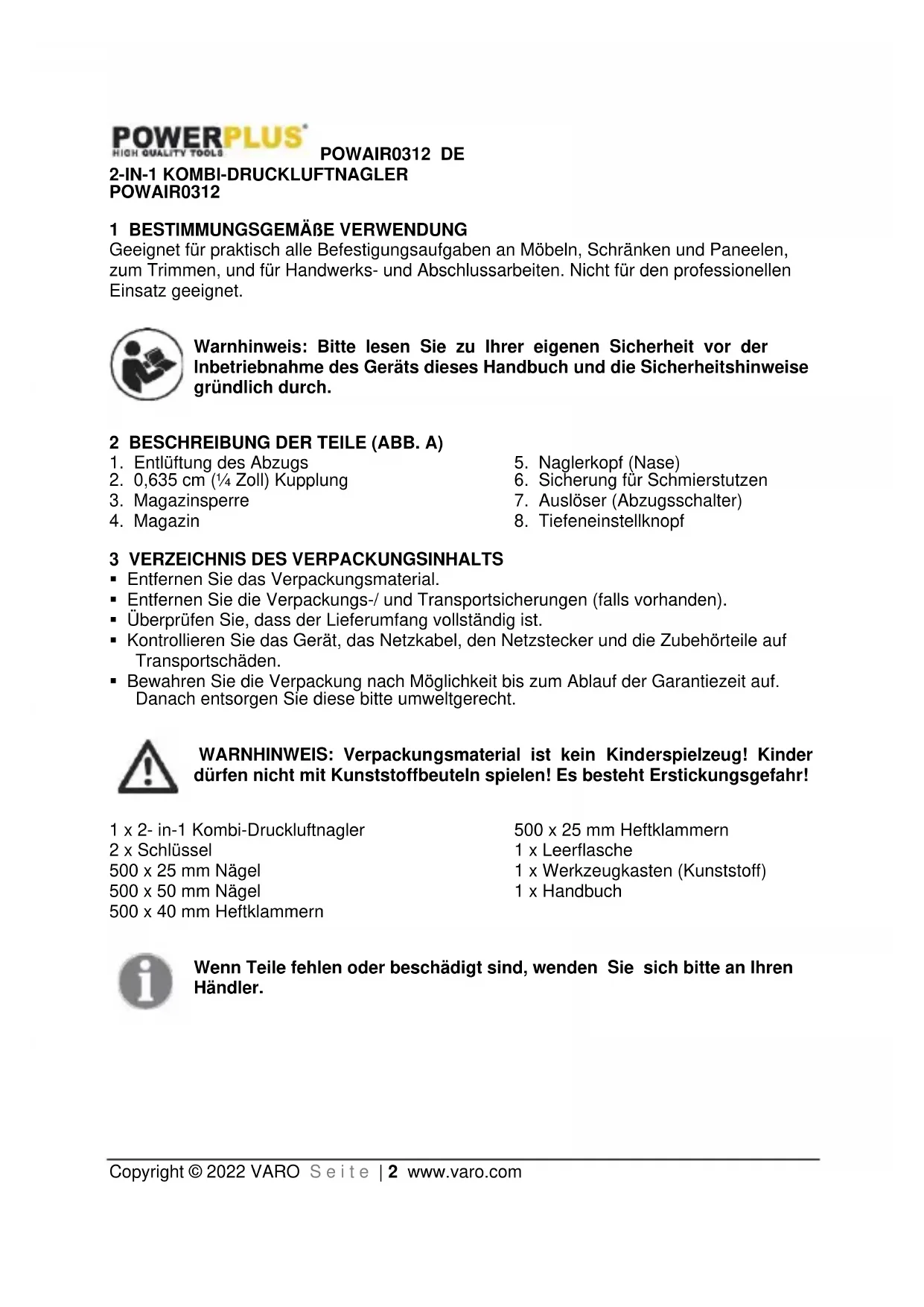 Copyright © 2022 VARO S e i t e | 2 www.varo.com 2-IN-1 KOMBI-DRUCKLUFTNAGLER POWAIR0312 1 BESTIMMUNGSGEMÄßE VERWENDUNG Geeignet für praktisch alle Befestigungsaufgaben an Möbeln, Schränken und Paneelen, zum Trimmen, und für Handwerks- und Abschlussarbeiten. Nicht für den professionellen Einsatz geeignet. Warnhinweis: Bitte lesen Sie zu Ihrer eigenen Sicherheit vor der Inbetriebnahme des Geräts dieses Handbuch und die Sicherheitshinweise gründlich durch. 2 BESCHREIBUNG DER TEILE (ABB. A)