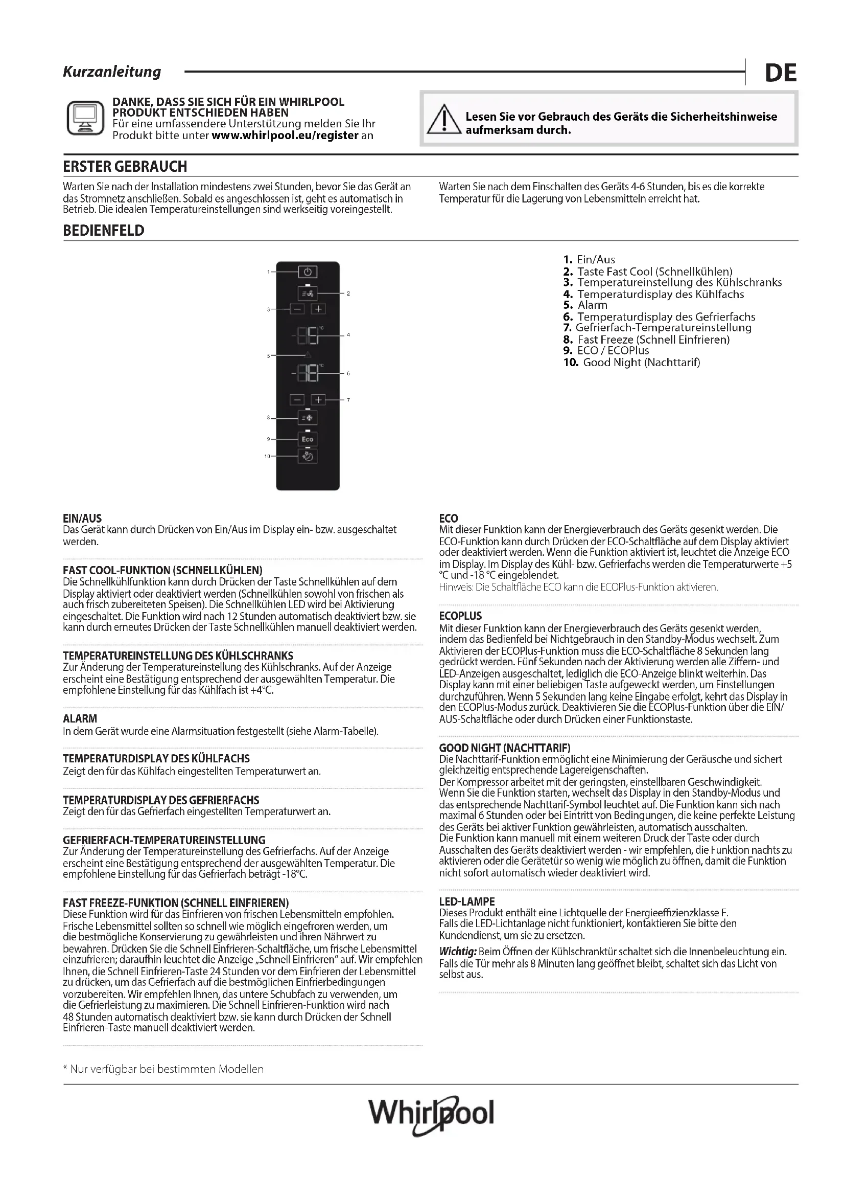 Für eine umfassendere Unterstützung melden Sie Ihr Produkt bitte unter www.whirlpool.eu/register an Lesen Sie vor Gebrauch des Geräts die Sicherheitshinweise aufmerksam durch. ERSTER GEBRAUCH Warten Sie nach der Installation mindestens zwei Stunden, bevor Sie das Gerät an das Stromnetz anschließen. Sobald es angeschlossen ist, geht es automatisch in Betrieb. Die idealen Temperatureinstellungen sind werkseitig voreingestellt. Warten Sie nach dem Einschalten des Geräts 4-6 Stunden, bis es die korrekte Temperatur für die Lagerung von Lebensmitteln erreicht hat. BEDIENFELD